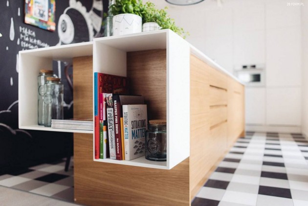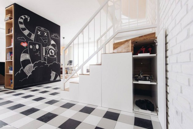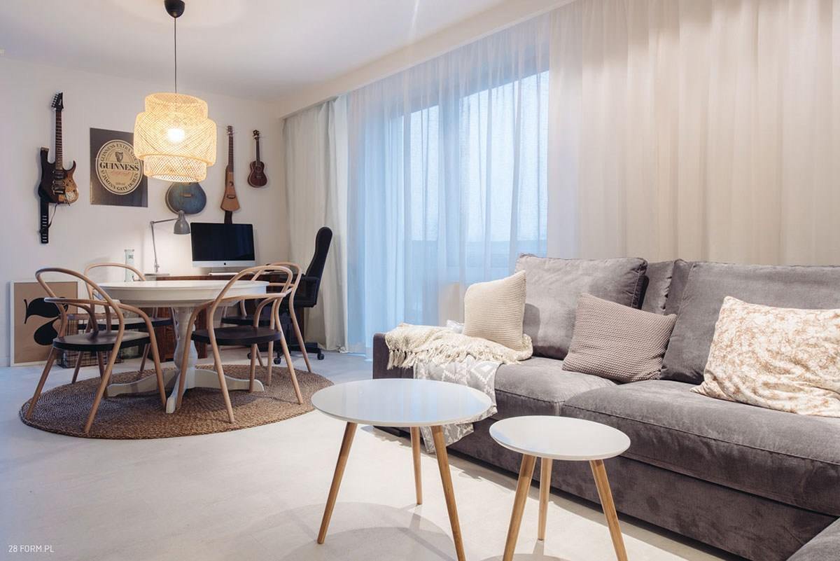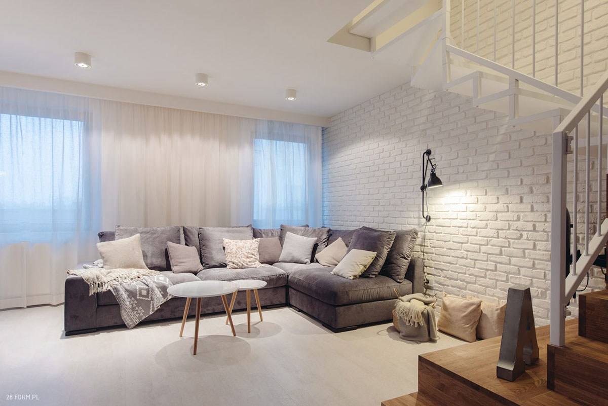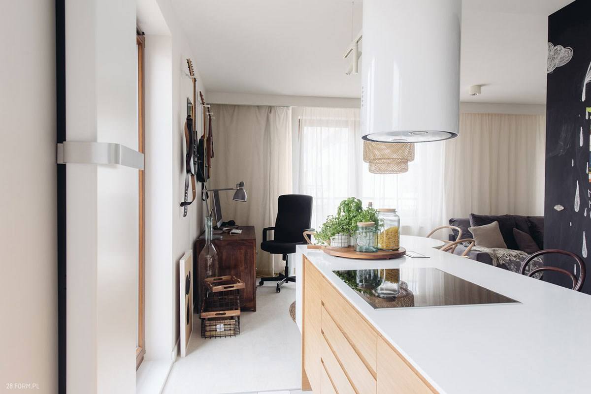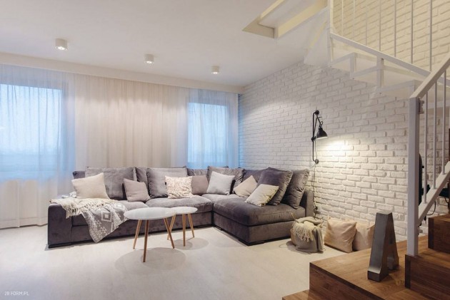 Arhitekte studija 28form vešto su boje zamenili jakim teksturama: belom opekom i crnom zidom na kojem se piše kredom. Ceo enterijer je u skandinavskim stilu, čija je odlika upotreba svetlih tonova u u kombinaciji s prirodnim materijalim kao što su drvo ili lan. Upravo je to ono što čini enterijer toplim i udobnim a ujedno vrlo atraktivnim i savremenim.