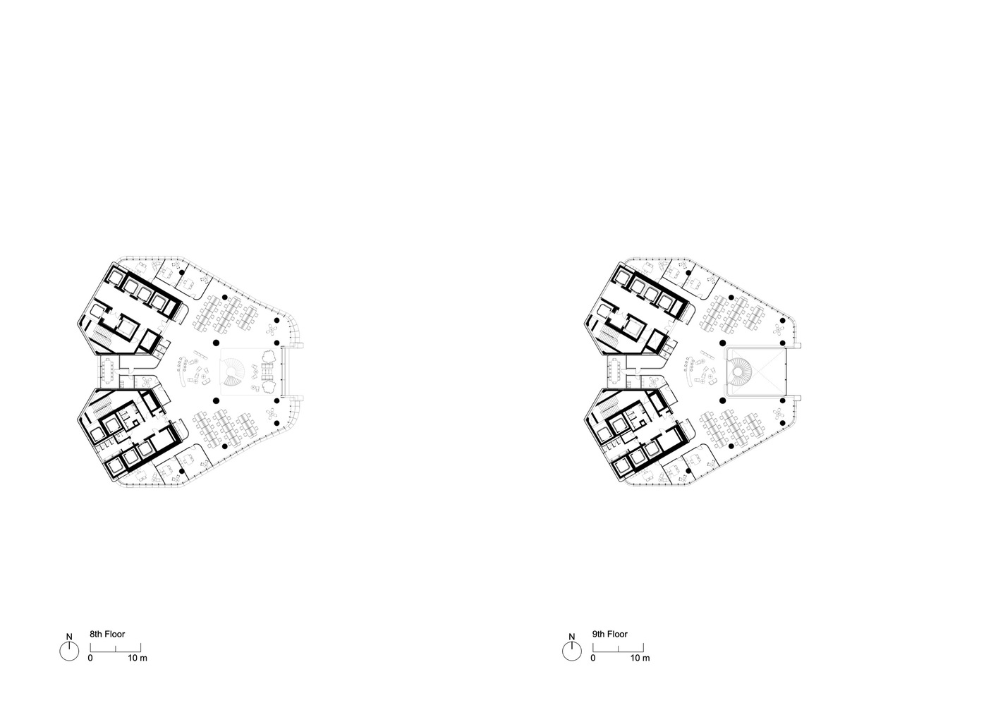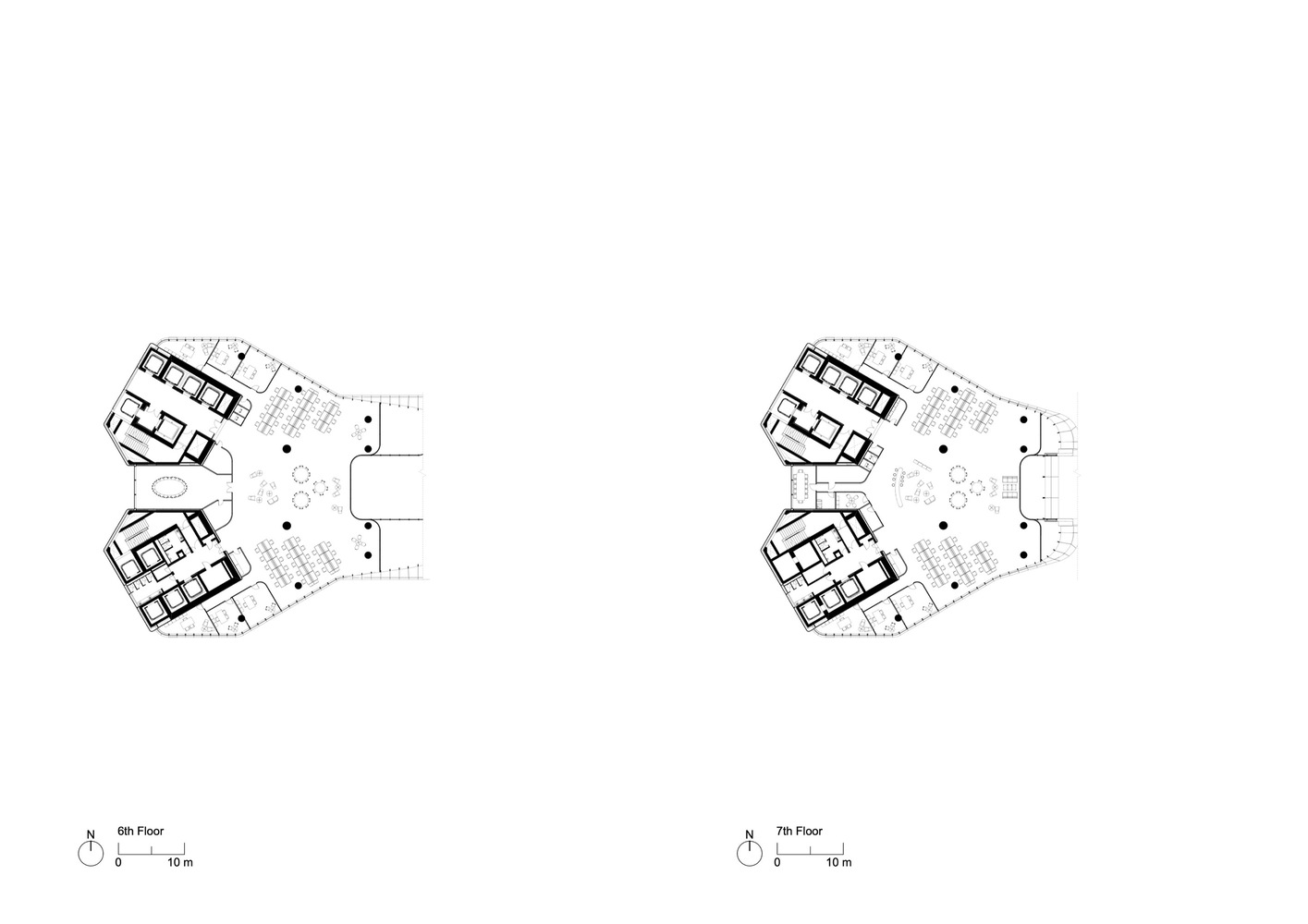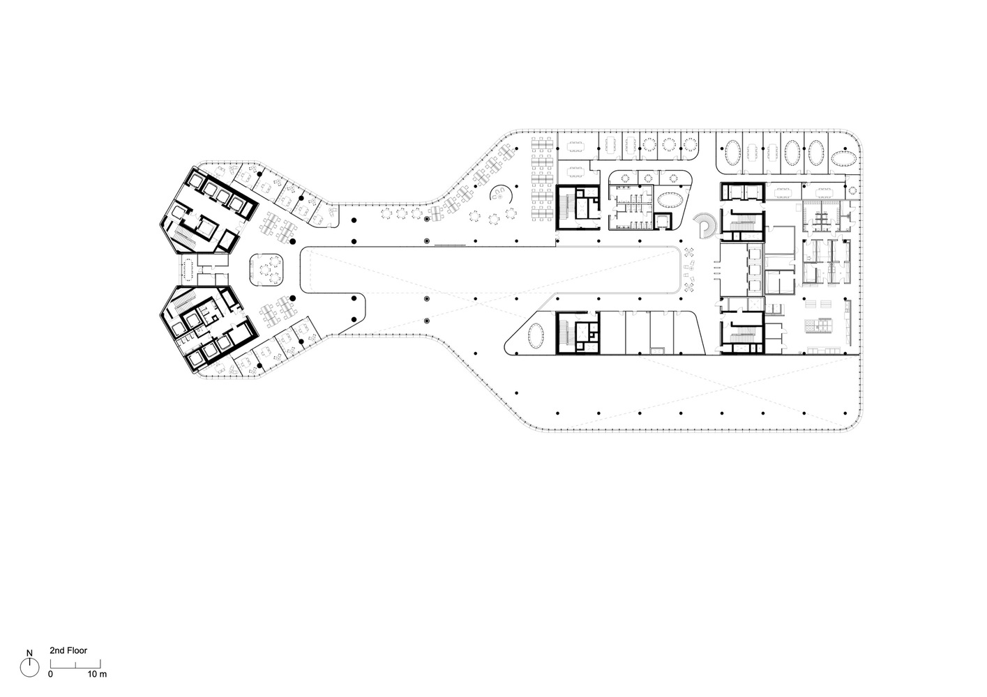 Na donjim etažama nalaze se restorani, teretana, konferencijski centar i čitav niz drugih sadržaja za osoblje, dok su fleksibilni poslovni prostori na gornjim nivoima.
