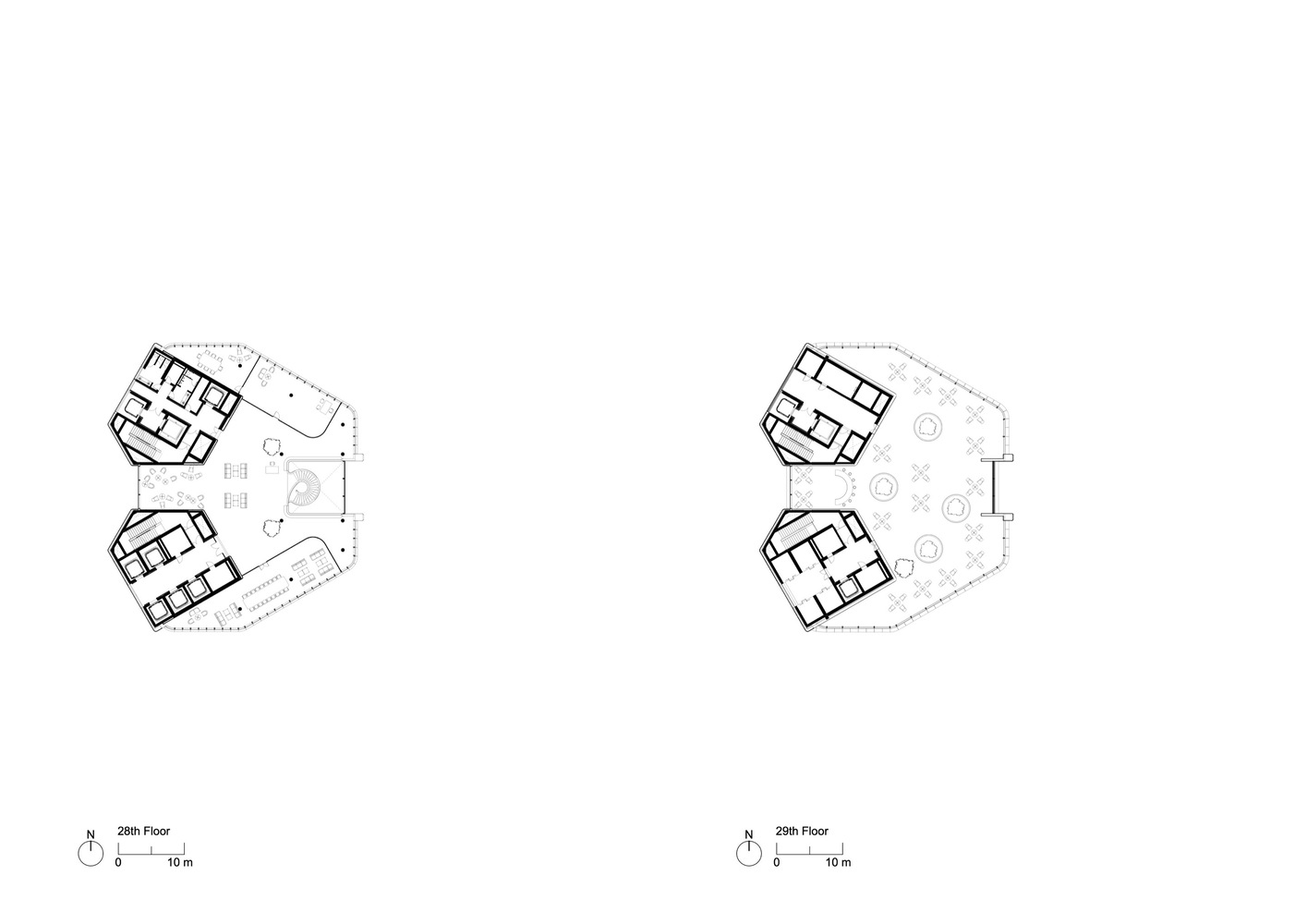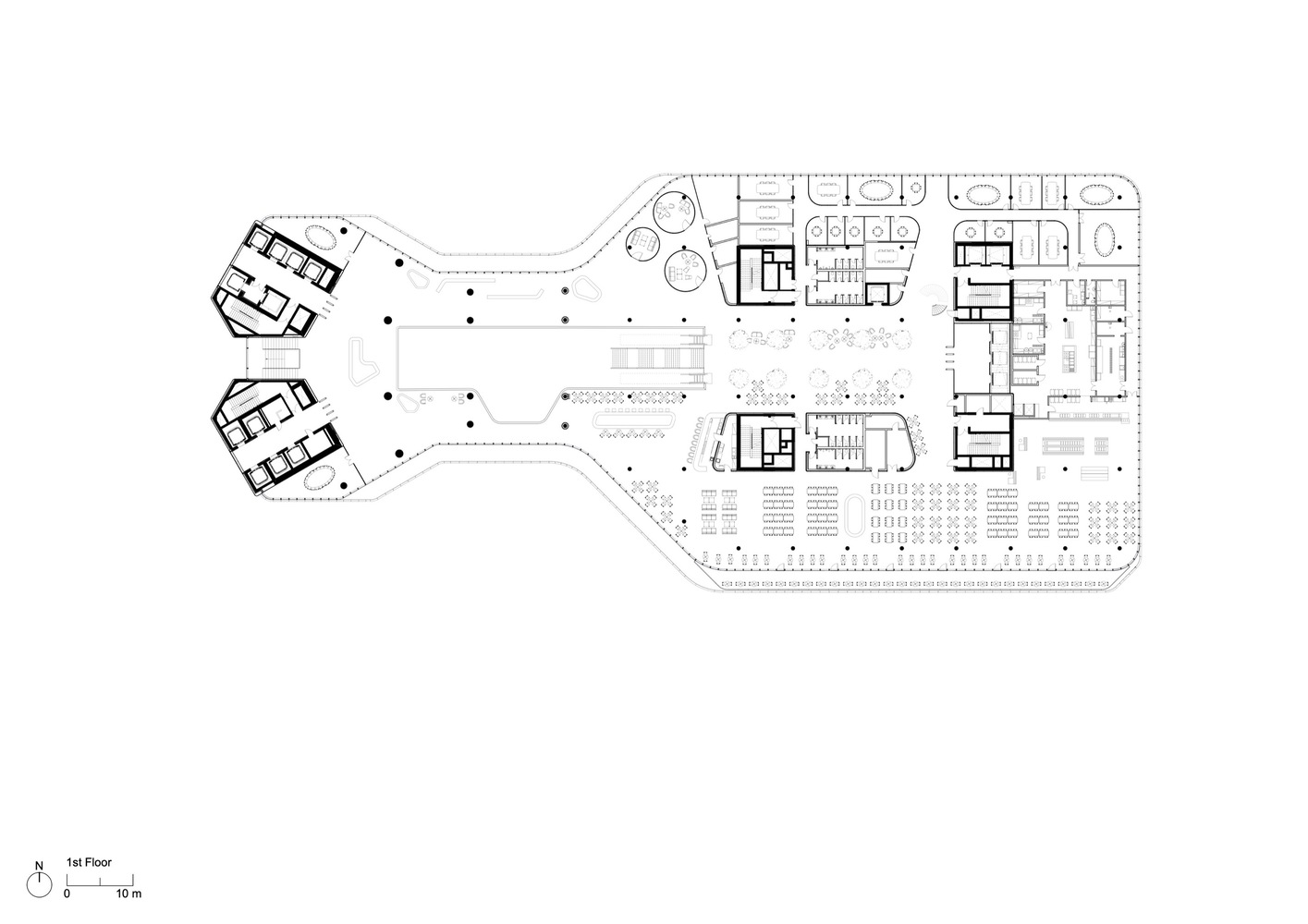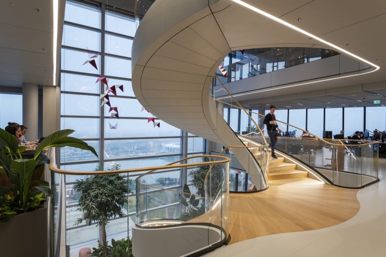 Na donjim etažama nalaze se restorani, teretana, konferencijski centar i čitav niz drugih sadržaja za osoblje, dok su fleksibilni poslovni prostori na gornjim nivoima.