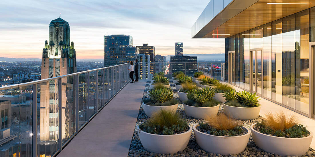 Odličan primer je krovna bašta na vrhu Tranzitnog centra Salesforce u San Francisku. Centar je otvoren u avgustu ove godine i na njegovom krovu se nalazi 13 bašti, centralni travnjak s drvećem i livada za piknik. Tu su još i brojne pokretne stolice i stolovi, amfiteatar s 800 mesta, dugačko šetalište i restoran. Uz to, svuda po parku su raštrkane lepo dizajnirane klupe na kojim zaposleni u centru mogu da se opuste tokom pauze. Dizajn ovog velikog parka koji se prostire na skoro 22.000 kvadrata potpisuje vrhunska firma za pejzažnu arhitekturu PWP.