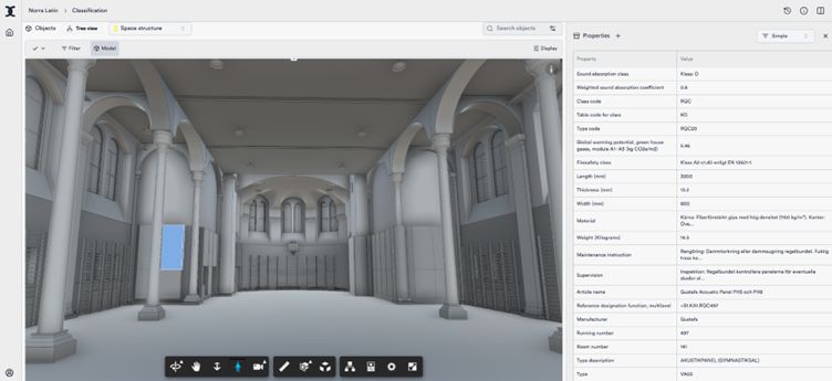 Asset Information Model (AIM) predstavlja strukturisani, digitalni prikaz podataka o objektu, koji omogućava kvalitetno upravljanje, održavanje i donošenje odluka tokom celog životnog veka objekta. U slučaju Norra Latin, svi podaci su organizovani prema standardu ISO 19650 i klasifikovani putem CoClass, švedskog klasifikacionog sistema zasnovanog na međunarodnoj normi IEC/ISO 81346.