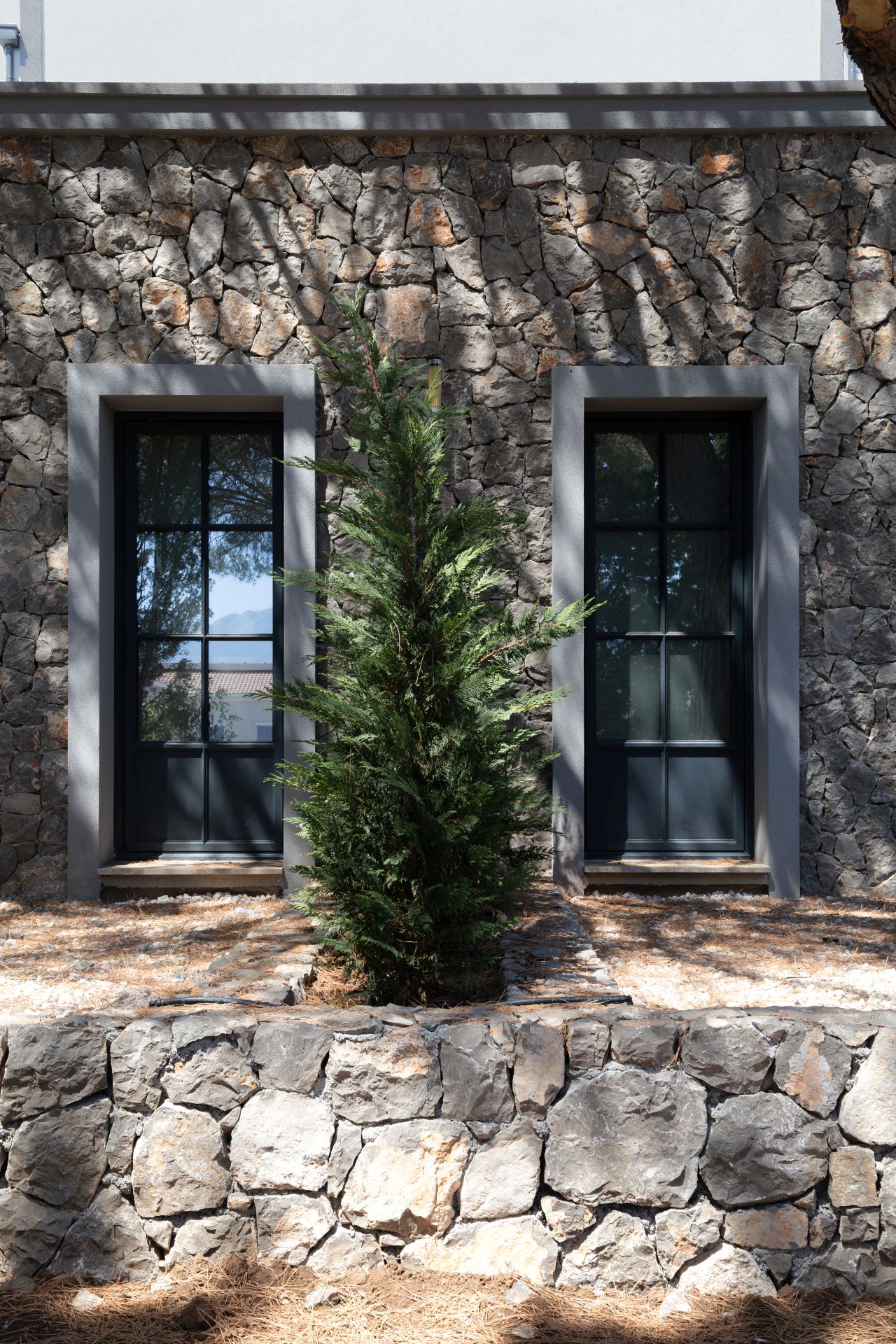 Eksterijer karakterišu silikatni malter, antracitna bravarija i kamen u suvomeđi, čime se postiže estetska svedenost i naglašava proporcija objekta.