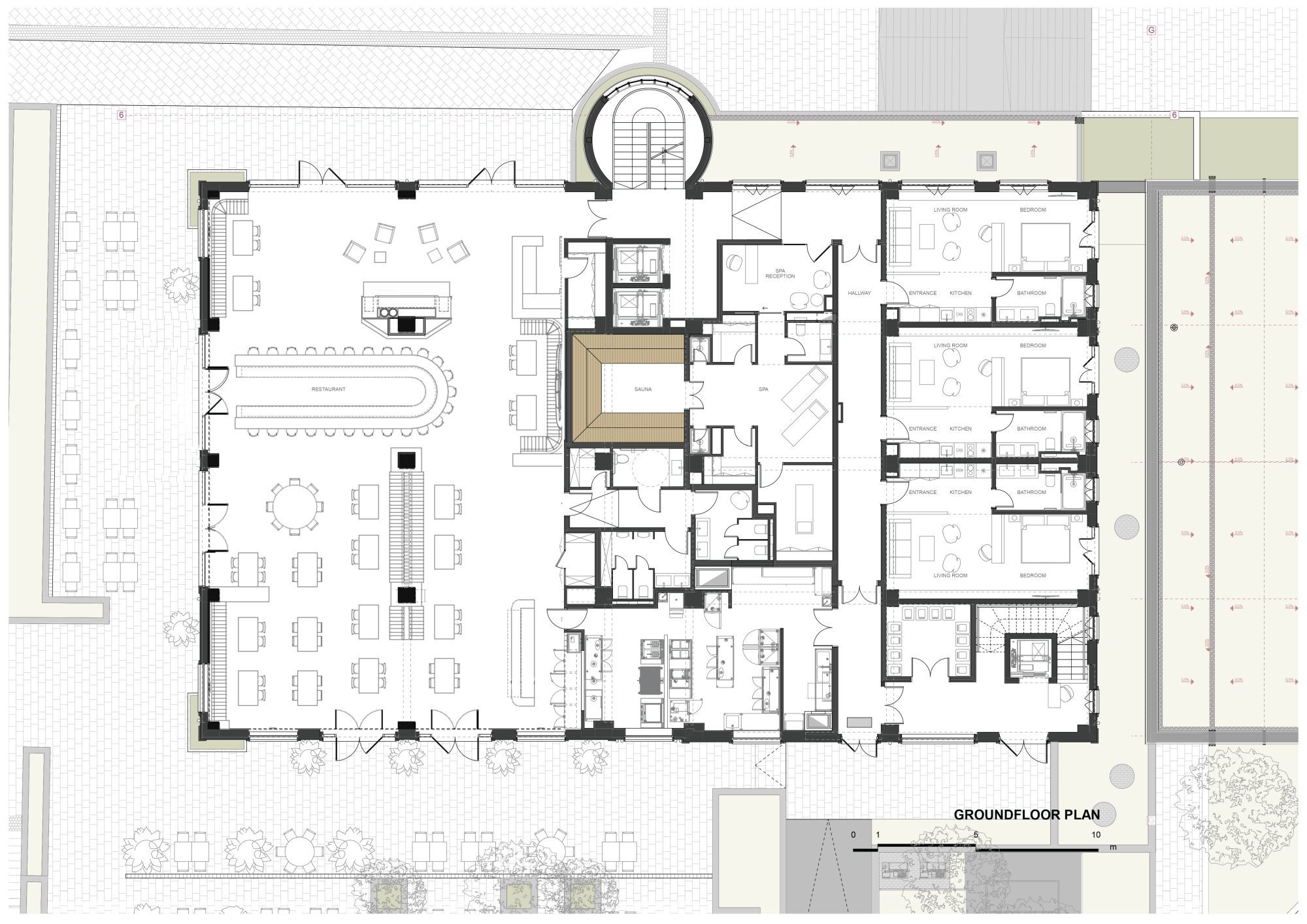 Prizemlje sadrži recepciju, restoran, bar, show-kuhinju, spa zonu i četiri smeštajne jedinice. U podrumu se nalaze tehničke prostorije, kantina za osoblje, glavna kuhinja i skladišta. Gornji nivoi nude 24 sobe i apartmana, dok aneks dodaje još četiri jedinice sa pogledom ka borovoj šumi.