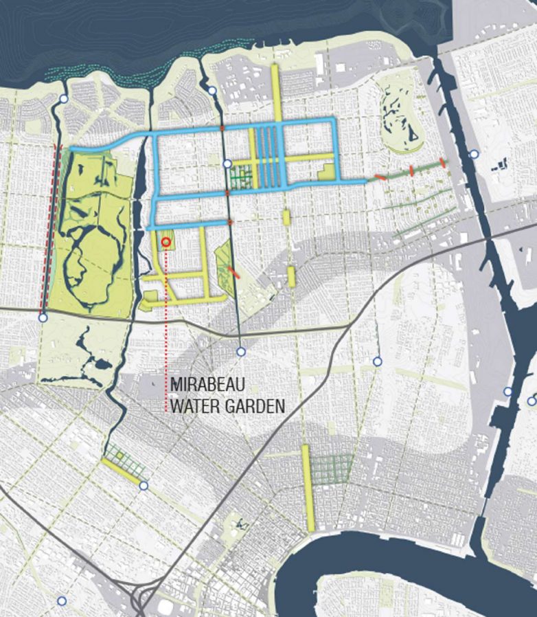 Mirabeau Water Garden predstavlja deo šireg gradskog plana za upravljanje vodama Nju Orleansa, sa ciljem da se unapredi sposobnost grada da izdrži poplave.