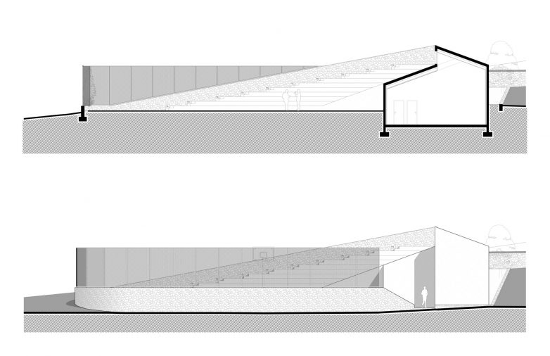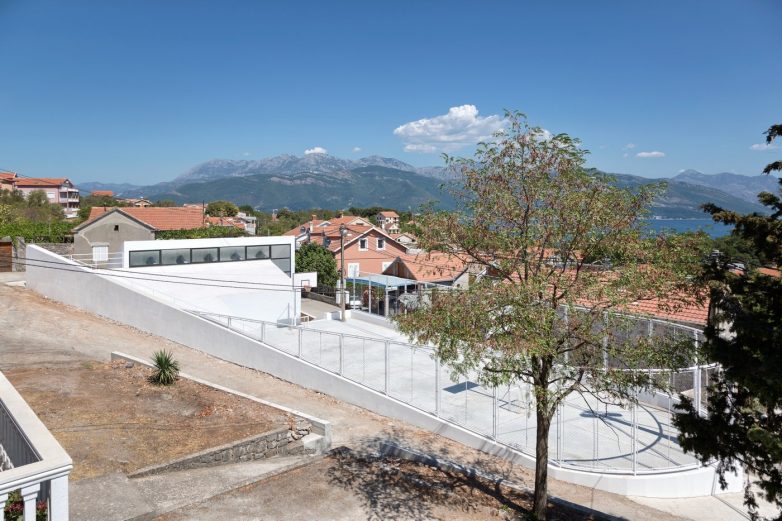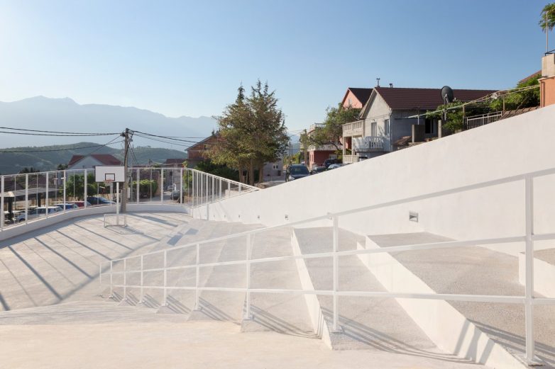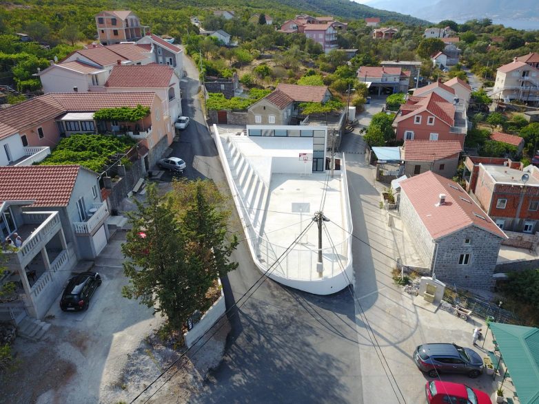 Dok teren lokacije definiše otvoreni prostor, koga čine poligon za različite aktivnosti (sportske, kulturne, zabavne) i tribine gledališta, objekat centra mesne zajednice je oblikovno i proporcijski usklađen sa okolnom seoskom arhitekturom arhetipske kuće široko rasprostranjene u primorskoj vernakularnoj arhitekturi. Da bi se izbegla monolitnost ovakvog objekta javne namene, te ostvarila kompoziciona skladnost s ostalim gradivnim elementima izvajane strukture, arhitekta je vertikalnim smicanjem dveju polovina objekta ujedno postigao gradacijsko raslojavanje površina (tako da se krovna ravan nižeg dela spušta do nivoa tribina prateći njihovu konturu) i oslobađanje delova vertikalne spojne površine, čime je omogućeno indirektno prirodno osvetljenje unutrašnjeg prostora centra.