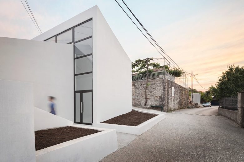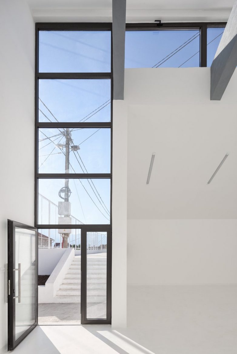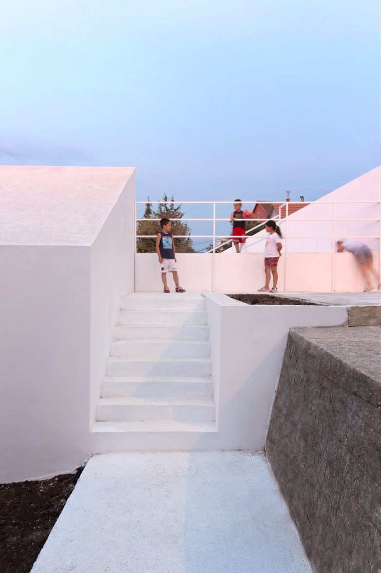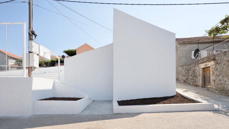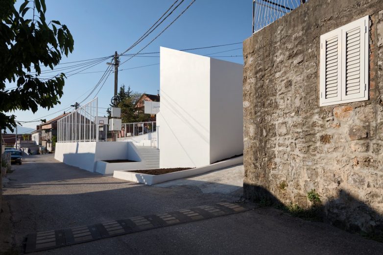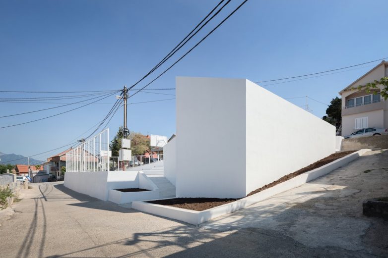 Unutrašnjost centra mesne zajednice je tako dobila karakter paviljona apsolutnog prostora, bez dodatnih otvora na fasadama, u kome događaj menja prostornost. Dematerijalizacija svih spoljašnjih i unutrašnjih površina postignuta je upotrebom beline koja diskretno korespondira s tradicionalno belim prozorskim oknima i kapcima (škurima) okolnih kuća. Belina određuje granicu celog gabarita čija kontura, načinjena od podzida različite visine i debljine, asocijativno referiše na geometrizovane kamene suhozide prisutne u mediteranskom kraškom pejzažu. Čak se i bela metalna ograda, koja funkcionalno uokviruje deo spoljašnjeg prostora, organski diskretno nadopunjuje na ostale oblike građenog sklopa, a njena ritmična mrežasta polja oponašaju dominantne kamene teksture u okruženju.