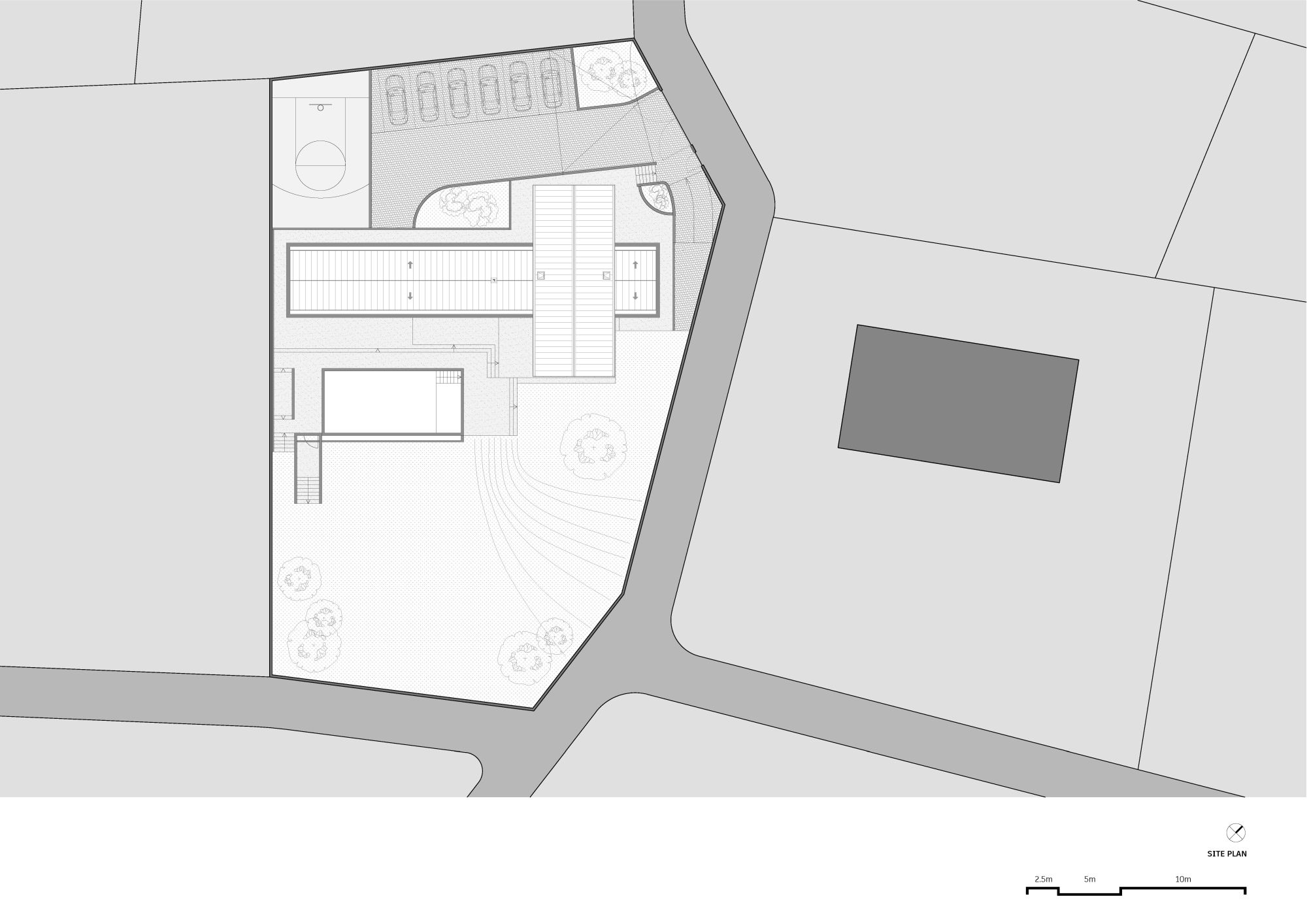 Kuća programski sadrži pristup automobilima, parking za šest vozila, kao i mali košarkaški teren. Omogućena je direktna komunikacija između pozadine i lica programa, uz prolaz između dnevnih sadržaja kuće i mašinske sobe.