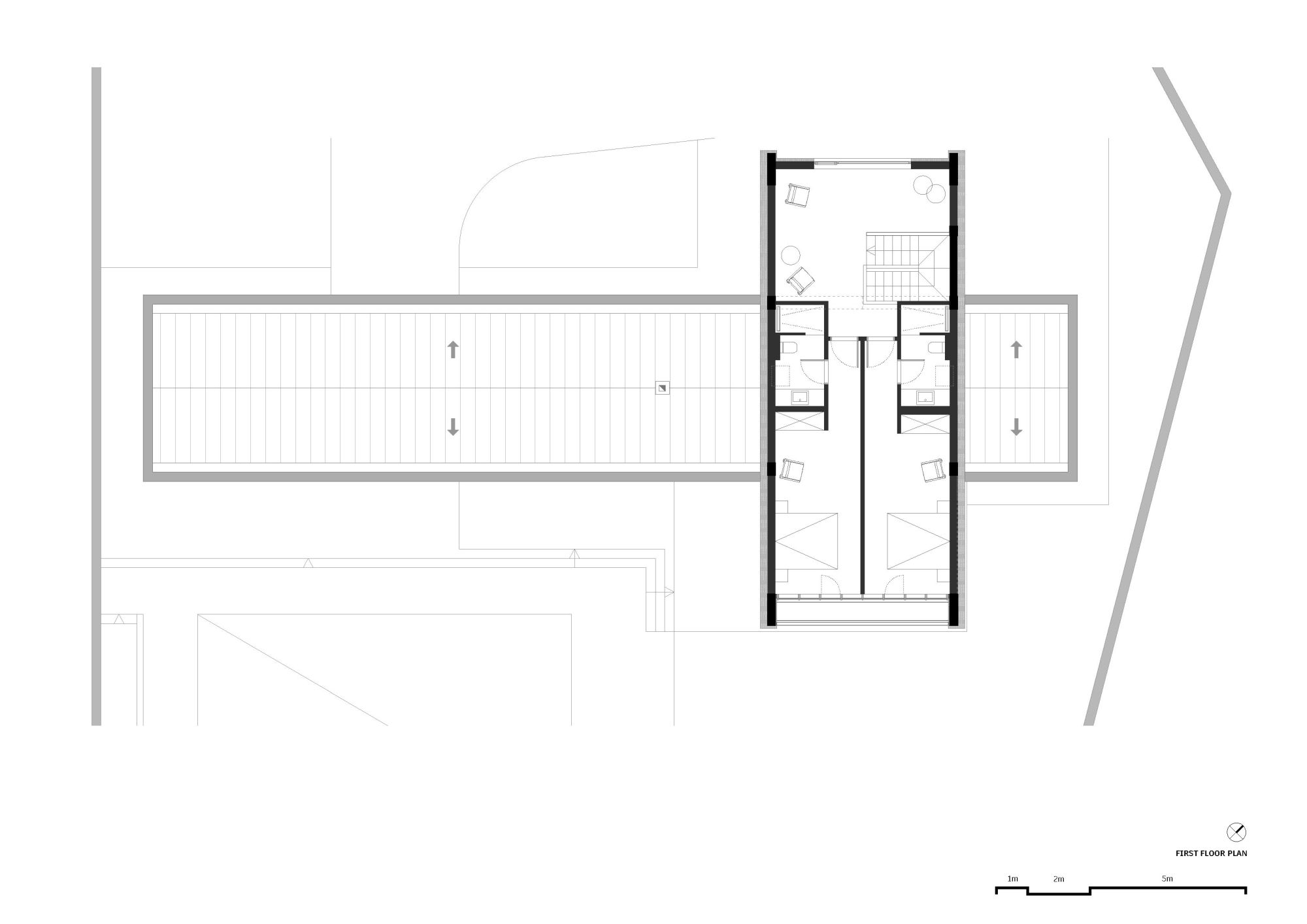 Na prvom spratu dolazite u slobodan multifunkcionalni predprostor koji vodi do dve identične spavaće sobe, sa odvojenim kupatilima, međusobno preslikanim kao u ogledalu.