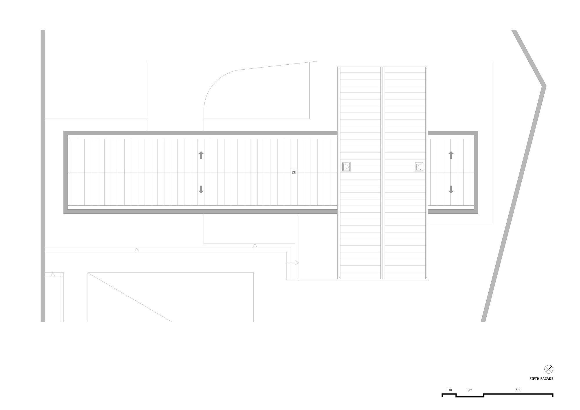 Volumetrijski pod je trouglasta prizma, koja se samo probija kroz tlo i horizontalnu notu zgrade i savršeno referencira planinske vrhove sa kojima je vizuelno u interakciji.