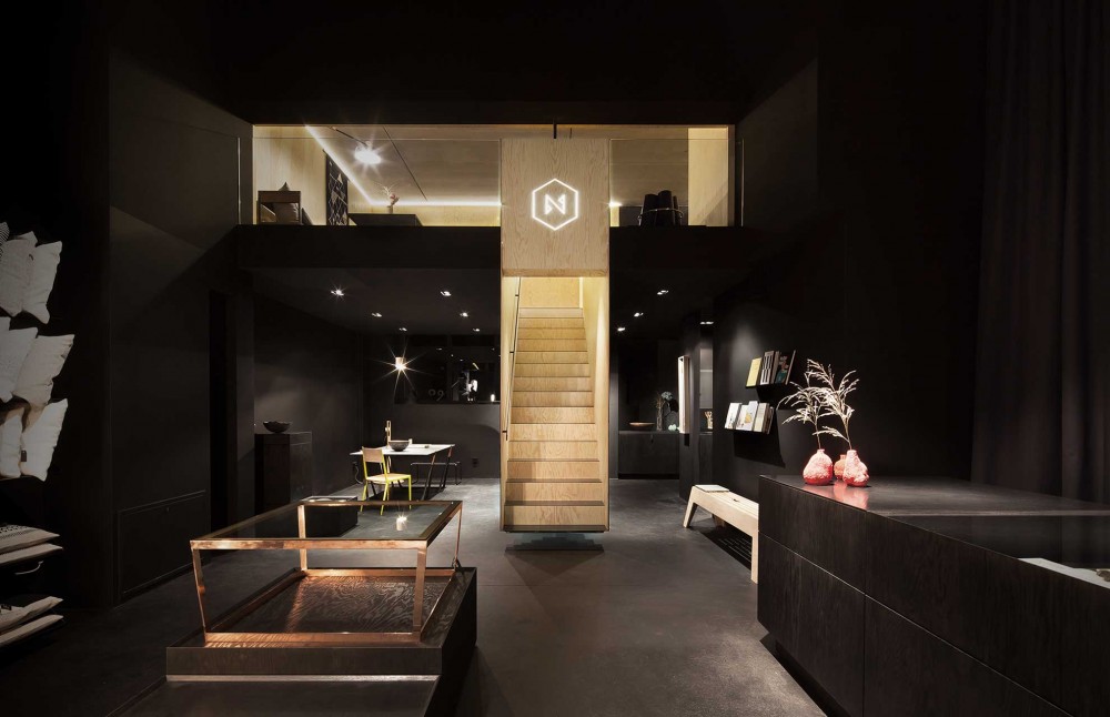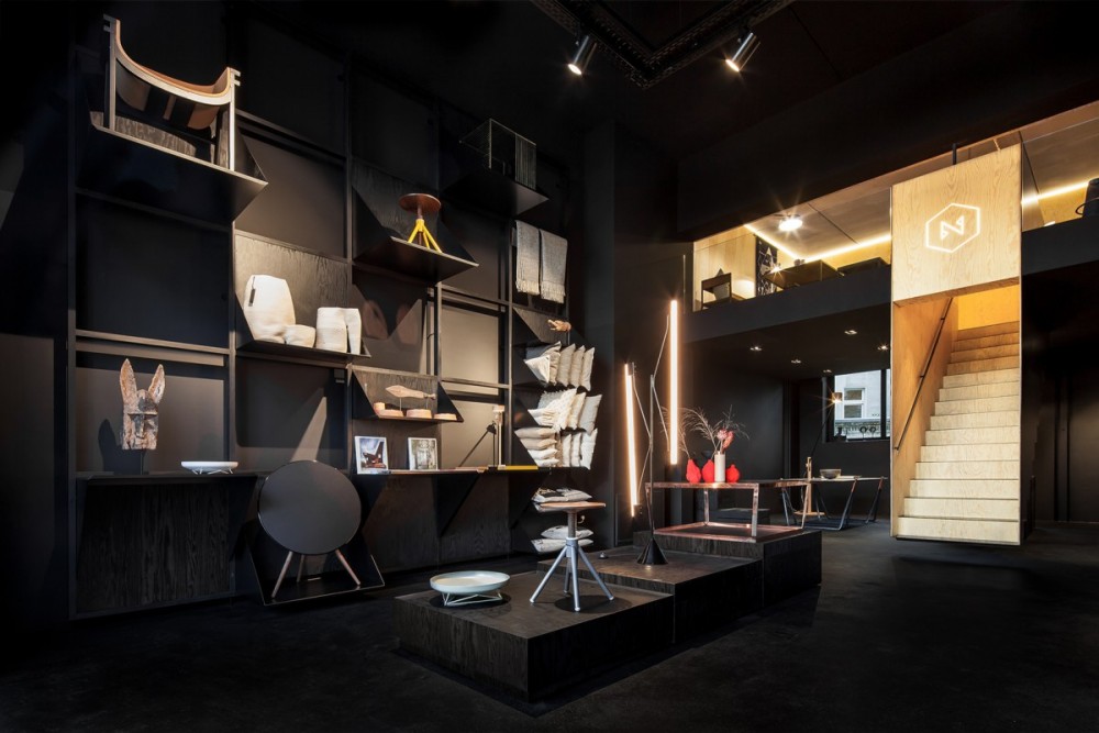 Za prezentaciju Bazar noir proizvoda korišćen je fleksibilan sistem, koji se sastoji iz kvadratnih ramova. Ovaj modularni sistem prekriva ceo jedan zid u prizemlju. Police se mogu podešavati kako bi mogle da nose proizvode različitog dizajna o veličine. Ova naizgled haotična struktura zapravo daje snažnu geometrijsku sliku.