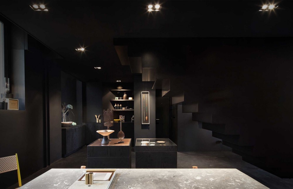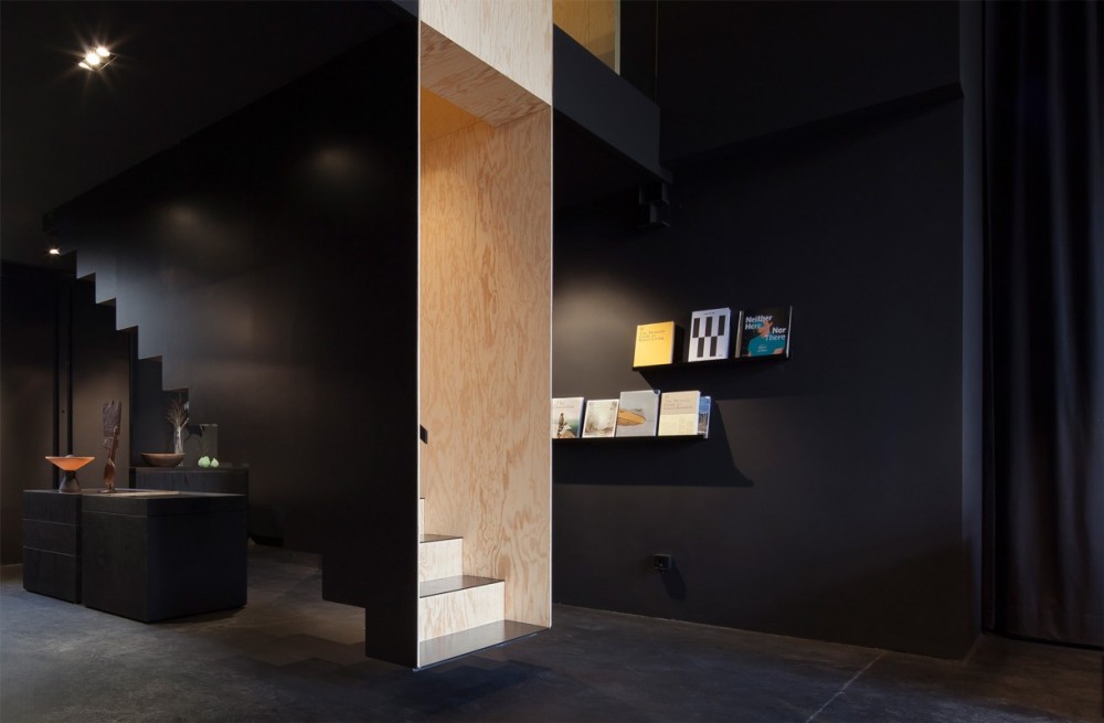 Komponenta koja povezuje ova dva prostora je stepenište koje predstavlja najupečatljiviji element prodavnice. Ono je konstruisano tako da izgleda kao da lebdi – nezavisno od ostatka prostora. Korišćenjem crne za spoljnu obradu i svetlog drveta za njegovu unutrašnjost pojačan je utisak pomalo nerealnog elementa u prostoru.