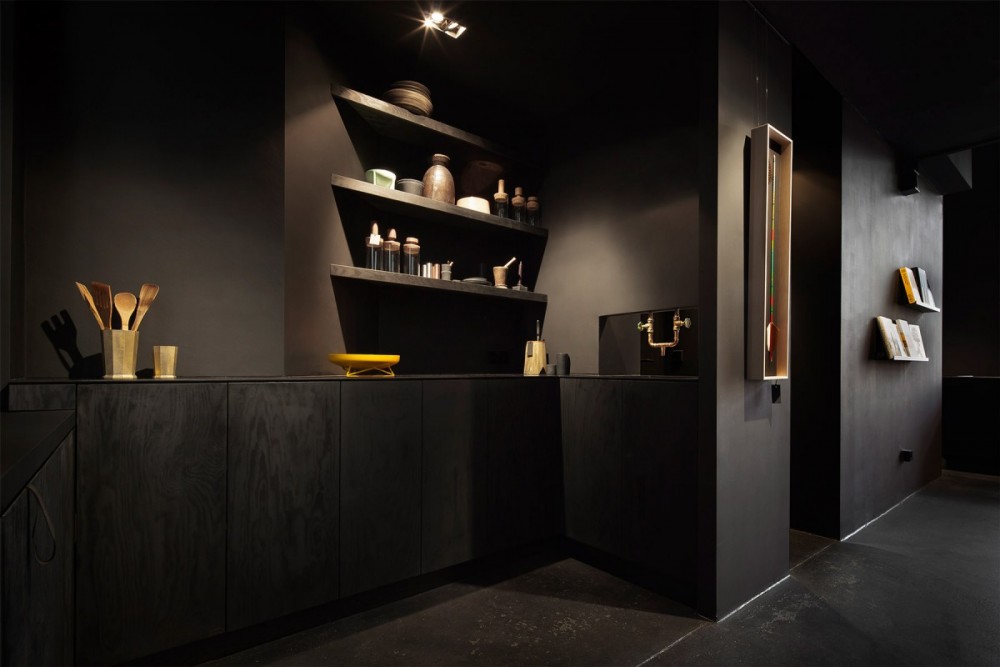 Crna boja je korišćena kako bi učvrstila opštu kompoziciju unutrašnjosti Bazar noira. Poseban izazov kod primene ove boje bio je da se održi isti ton na različitim površinama i materijalima. Na spratu je, međutim, ostvaren potpuni kontrast korišćenjem teksture primorskog bora. Ovim je postignuto da sprat može biti u isto vreme povezan ali i odvojen od ostalog dela prodavnice.