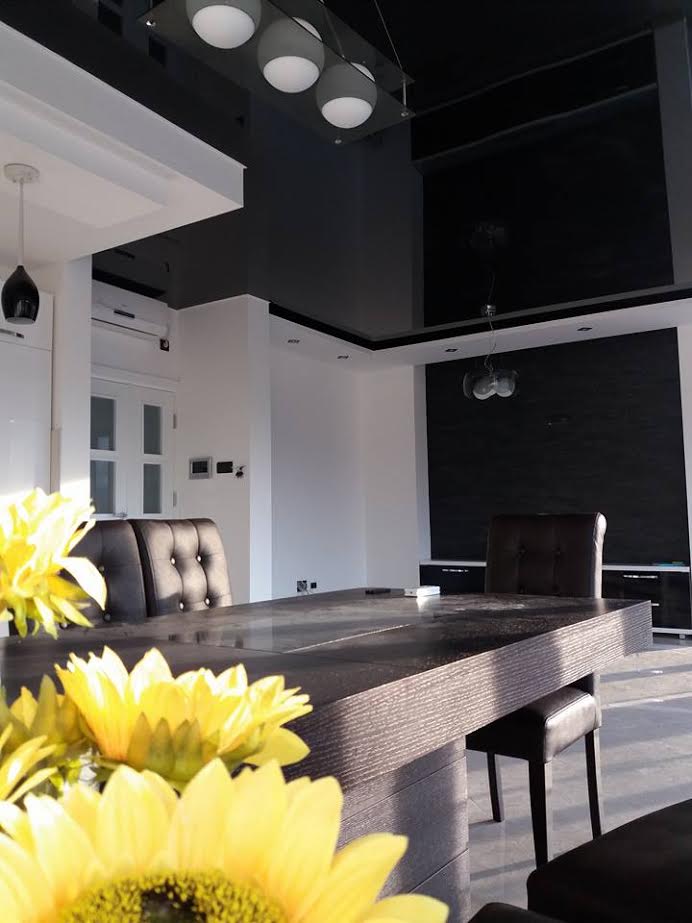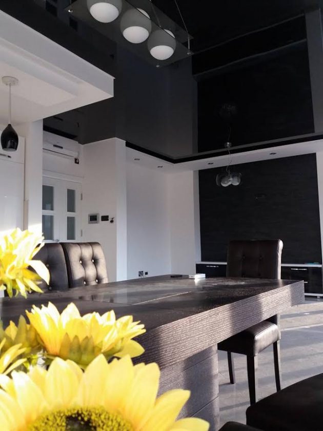 U ovom primeru, primenjen je elastični plafon „Forma Crna-Lak“ koji je u savršenom kontastu sa belim kuhinjskim frontovima. Pored toga, elastični plafon je dobar je može da izdrži poplave od nesavesnog komšije iznad vas a takođe, zauvek je rešen problem buđi i plesni u sanitarnim prostorijama.