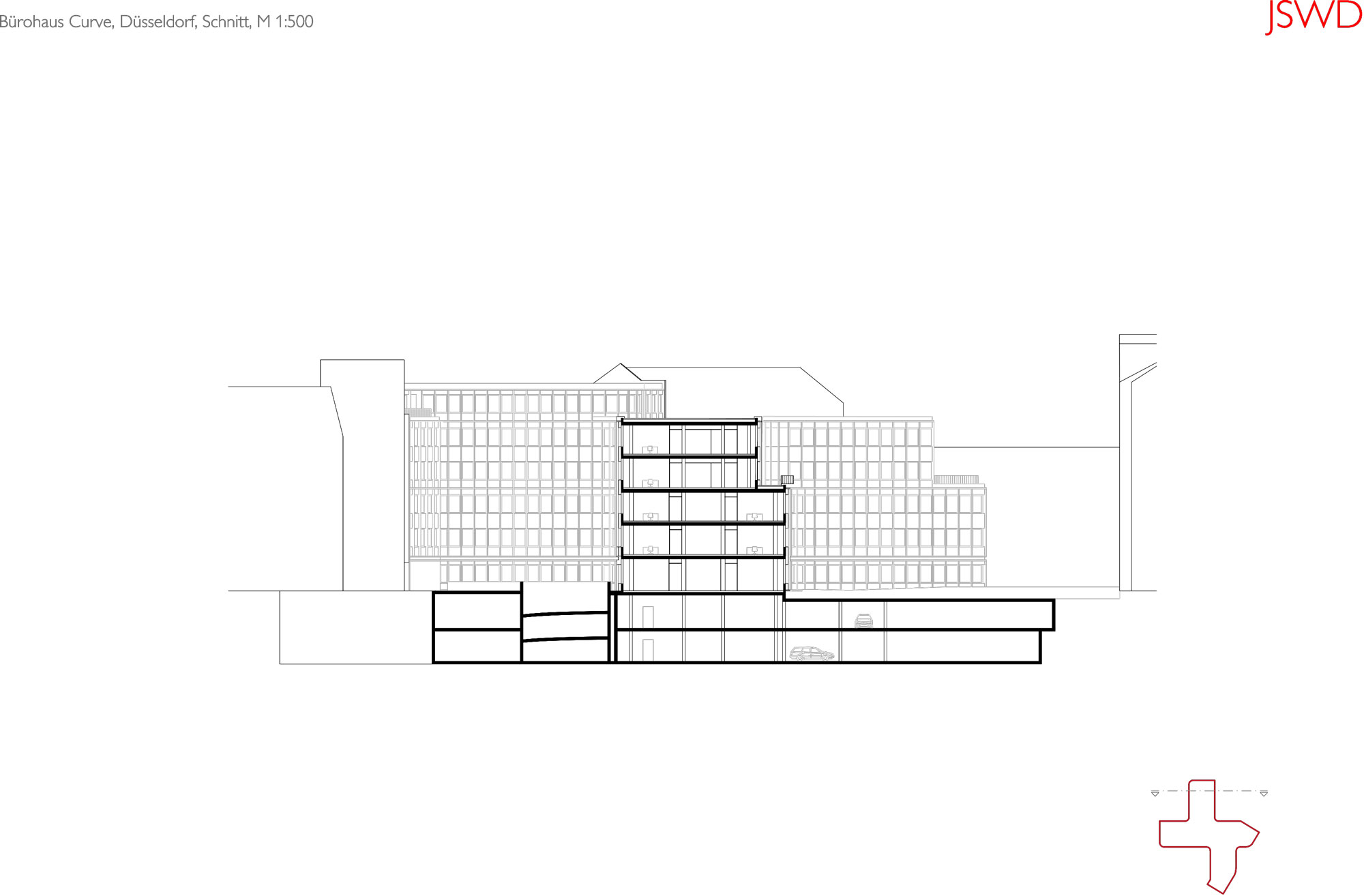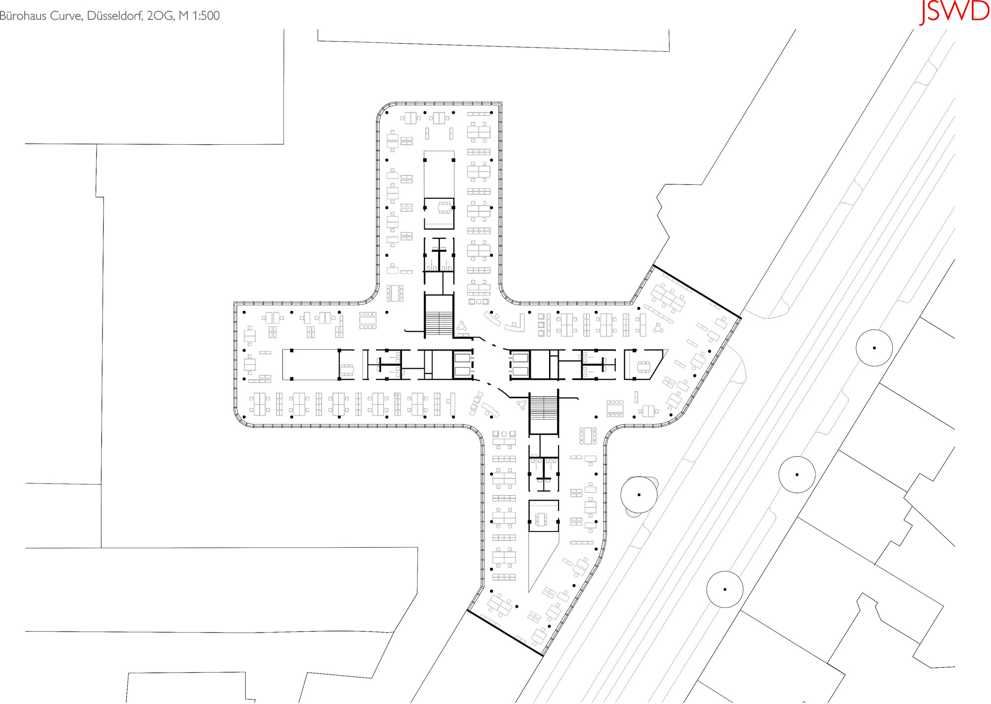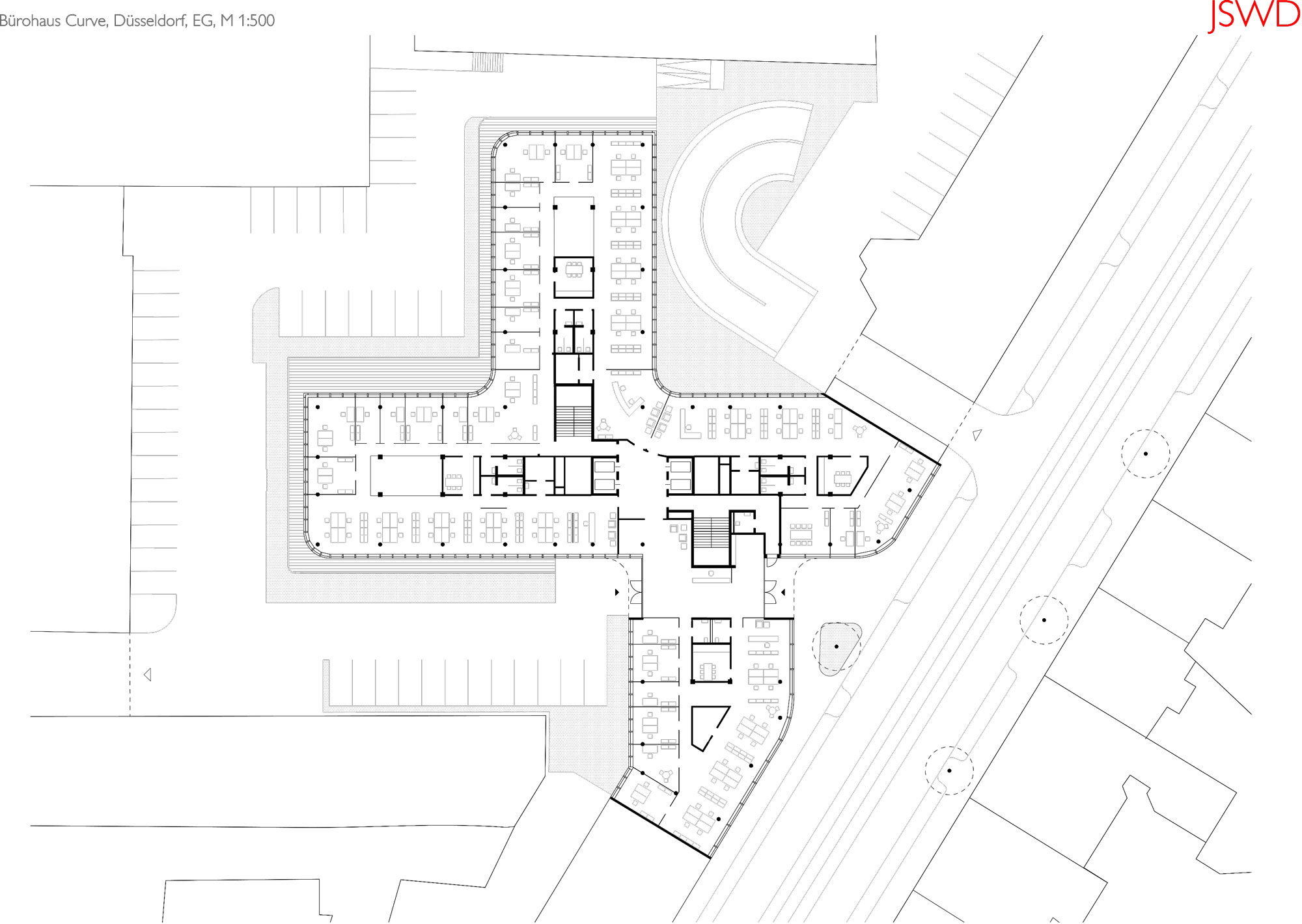 Nekada prazan plac u srcu Diseldorfa danas zauzima jarkocrvena poslovna zgrada Curve Offices, delo arhitektonskog studija JSWD iz Kelna. Investitor, kompanija Becken Development GmbH iz Hamburga, u projekat površine 21.000 kvadrata uložio je 30,8 miliona evra.