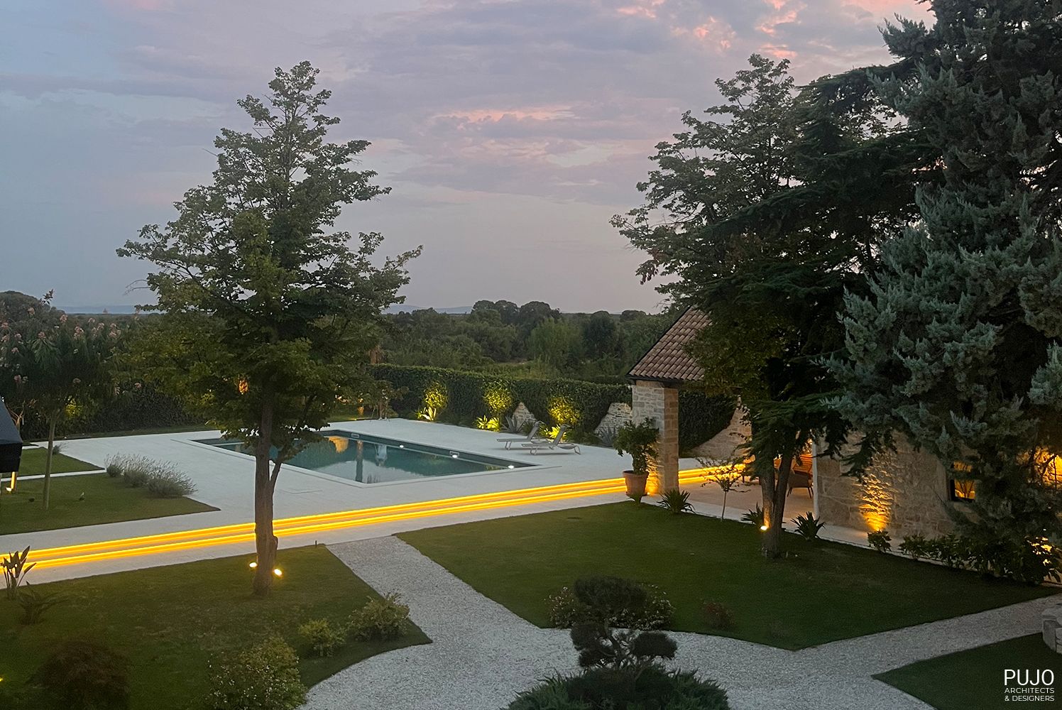 Posebna pažnja posvećena je hortikulturi ovog nemalog prostora. Svi postojeći četinari su sačuvani i integrisani u novi pejzažni koncept, a vlasnici ovog imanja su iz svog maslinjaka doneli i dve masline.