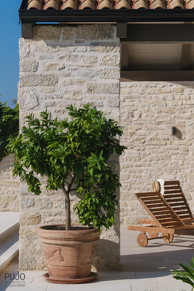 Pažljiv odabir primorskog zelenila, krov pokriven mediteranskim crepom i karakterističan miris kamena u letnjim večerima daju dozu gostoprimljivosti i pozivaju na čašu vina, pršut i sir među kamenim zidovima.