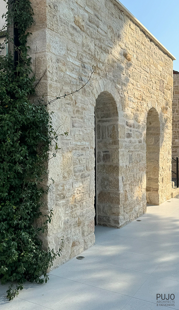 Zapuštenoj i bršljanom zarasloj starini udahnuta je draž minulih vremena pre svega upotrebom autohtonog dalmatinskog kamena čija grubost i tekstura evociraju istrajan i otporan duh podneblja.