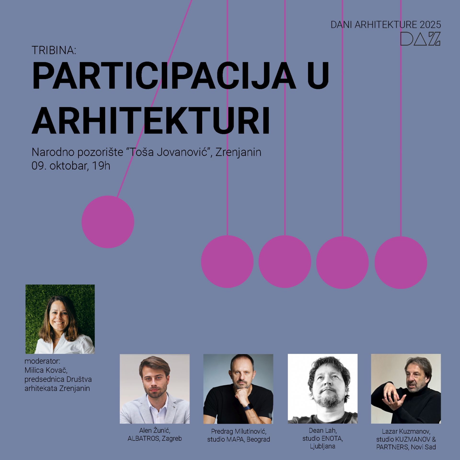 U okviru manifestacije Dani arhitekture 2025, u Zrenjaninu će se u četvrtak, 9. oktobra, održati tribina pod nazivom „Participacija u arhitekturi“ koju organizuje Društvo arhitekata Zrenjanina (DAZ). Mesto održavanja je dramska scena Pozorišta „Toša Jovanović“ u Zrenjaninu, a početak je najavljen za 19 časova.