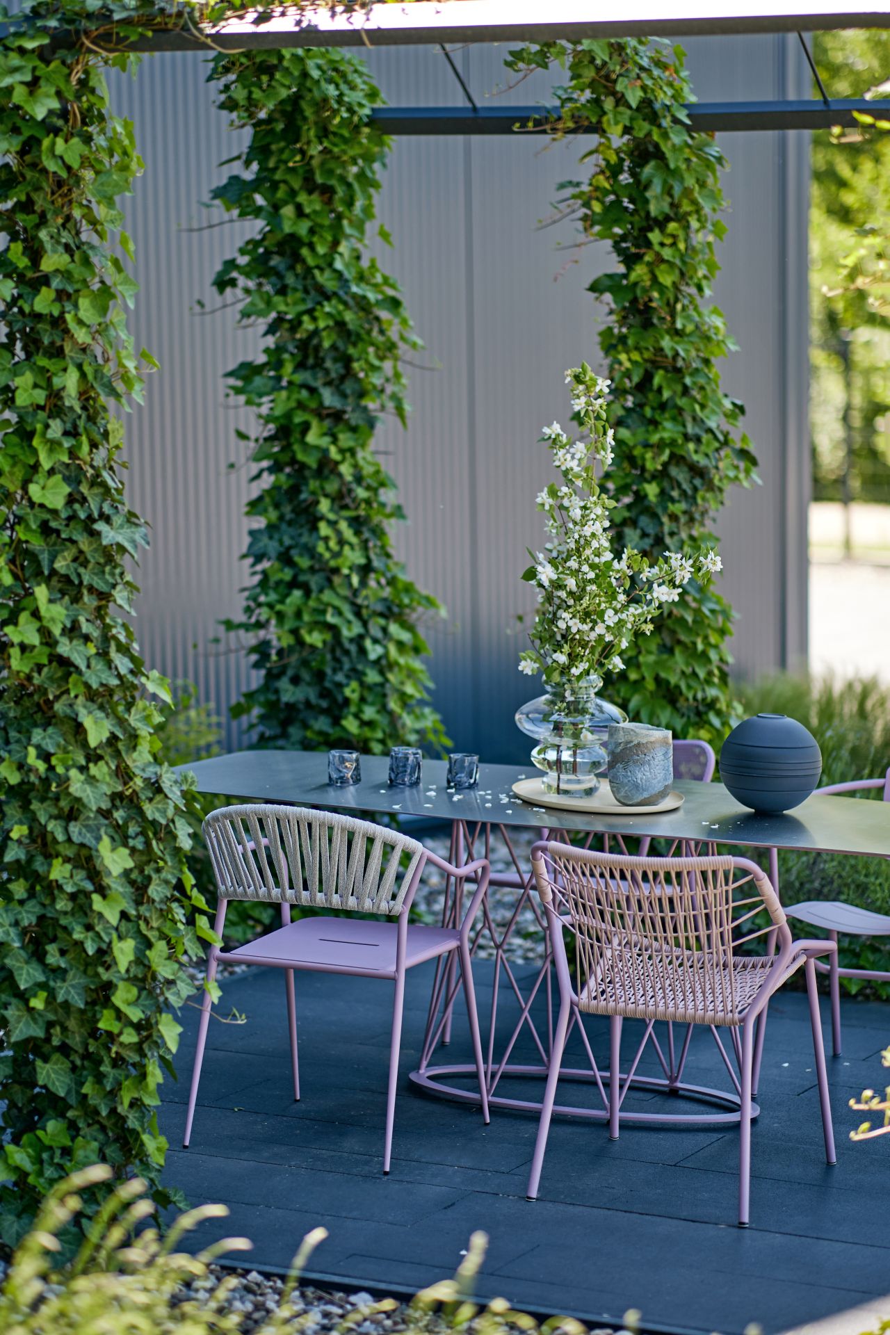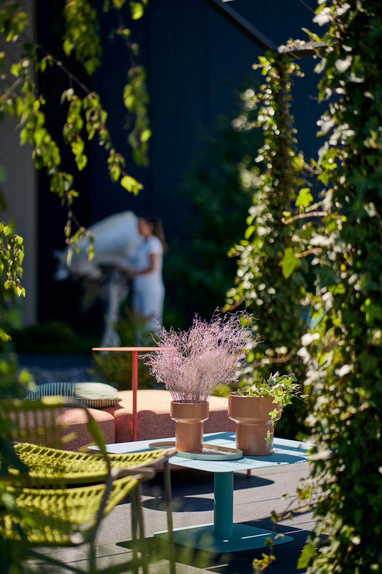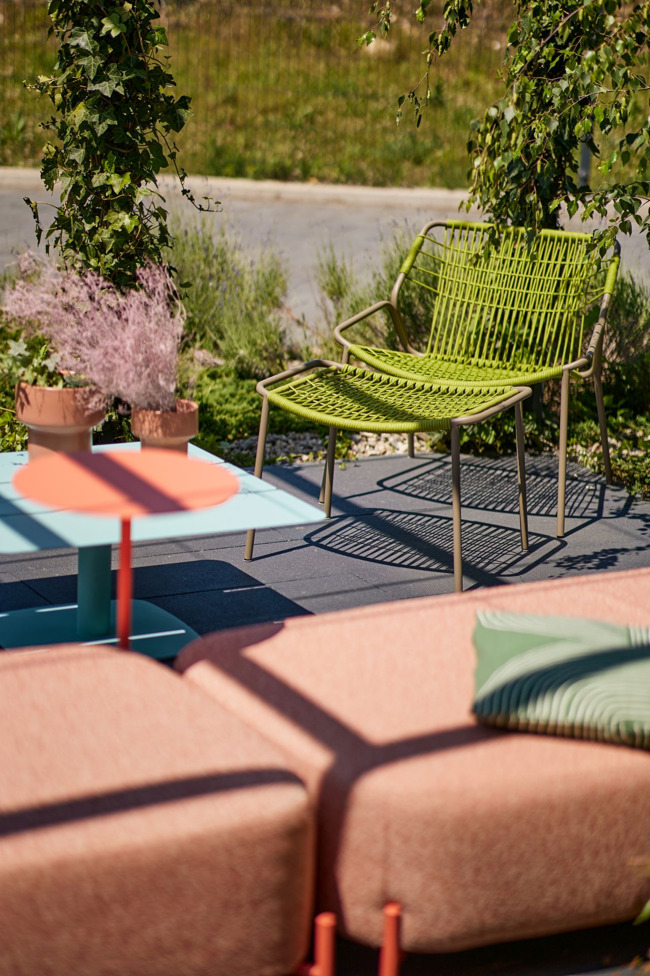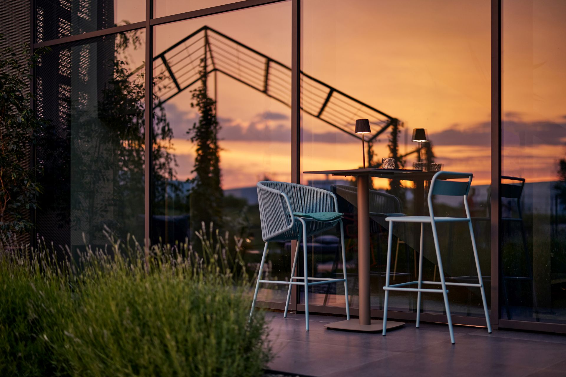 Nasuprot crnoj, kao svojevrsni opozit, smešteni su raznobojni komadi dizajniranog spoljašnjeg nameštaja, formirajući udobne, prefinjene i suptilne mikroambijente.