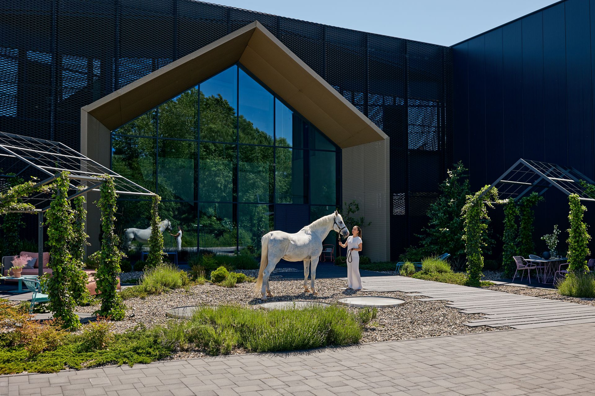 Međutim, dizajneri se nisu zaustavili na izboru crne boje za sam objekat – ona se razliva i pretače na eksterijer – na metalne strukture, ulazna vrata, logo kompanije, popločane površine, akcentovanu široku razigranu stazu, keramiku na ulazu, posude za biljke.
