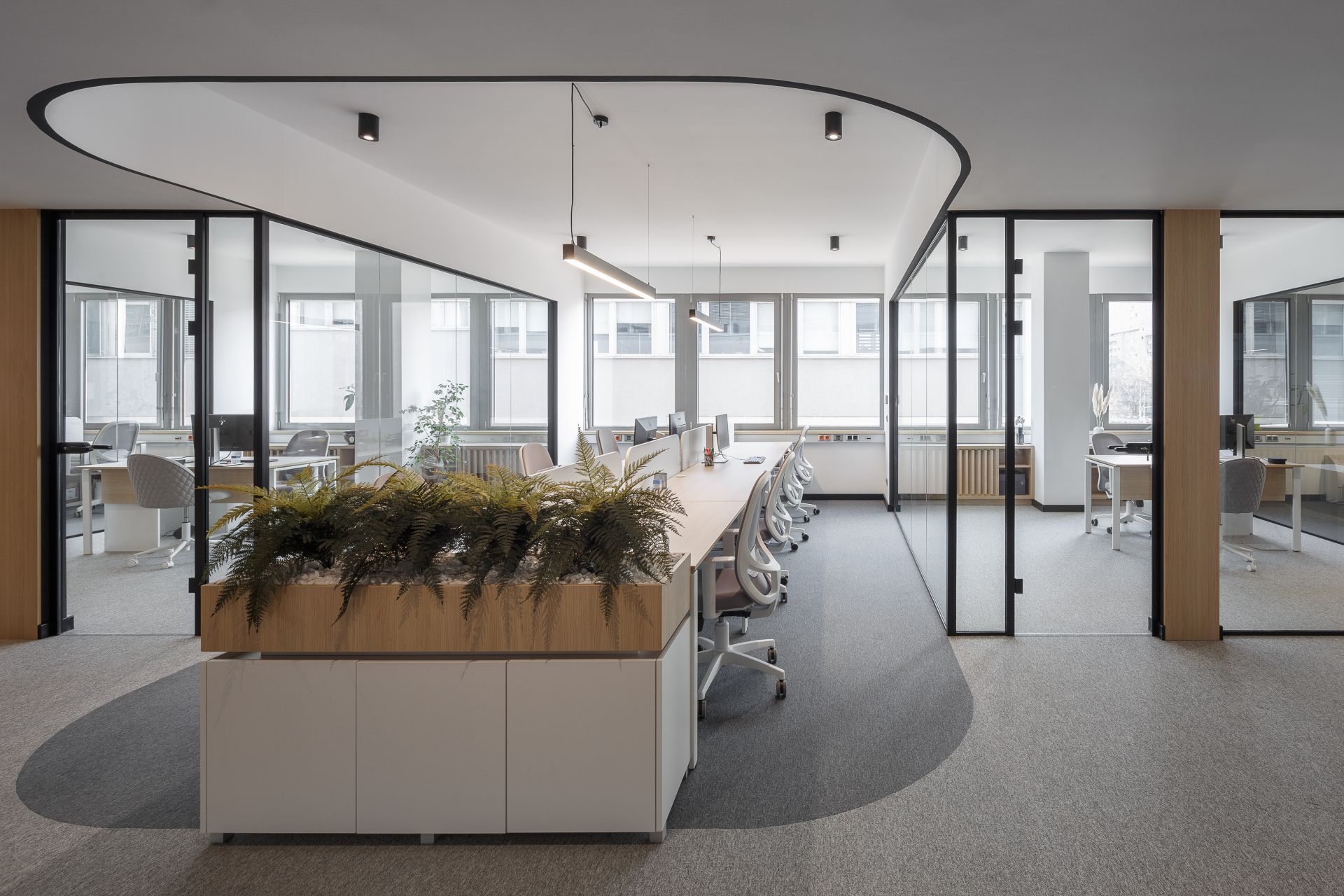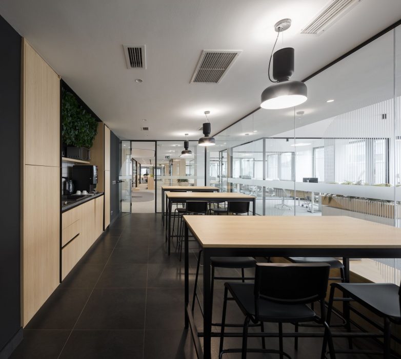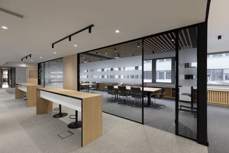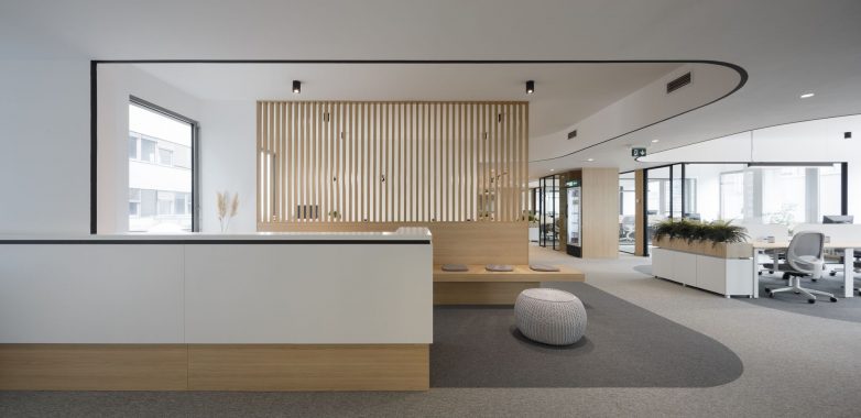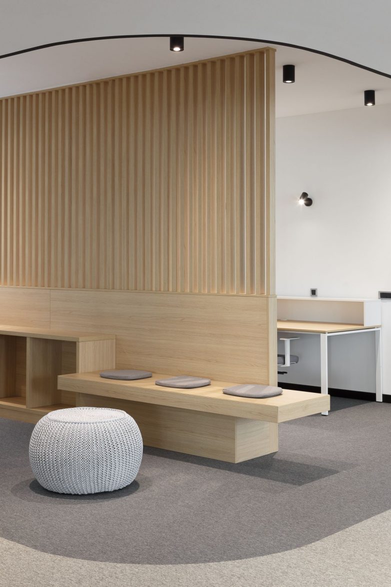 Uključivanjem drvenih obloga i nameštaja, prostor je dodatno obogaćen prirodnim materijalom, koji pravi balans između uređenog kancelarijskog prostora i toplog okruženja za boravak zaposlenih.
