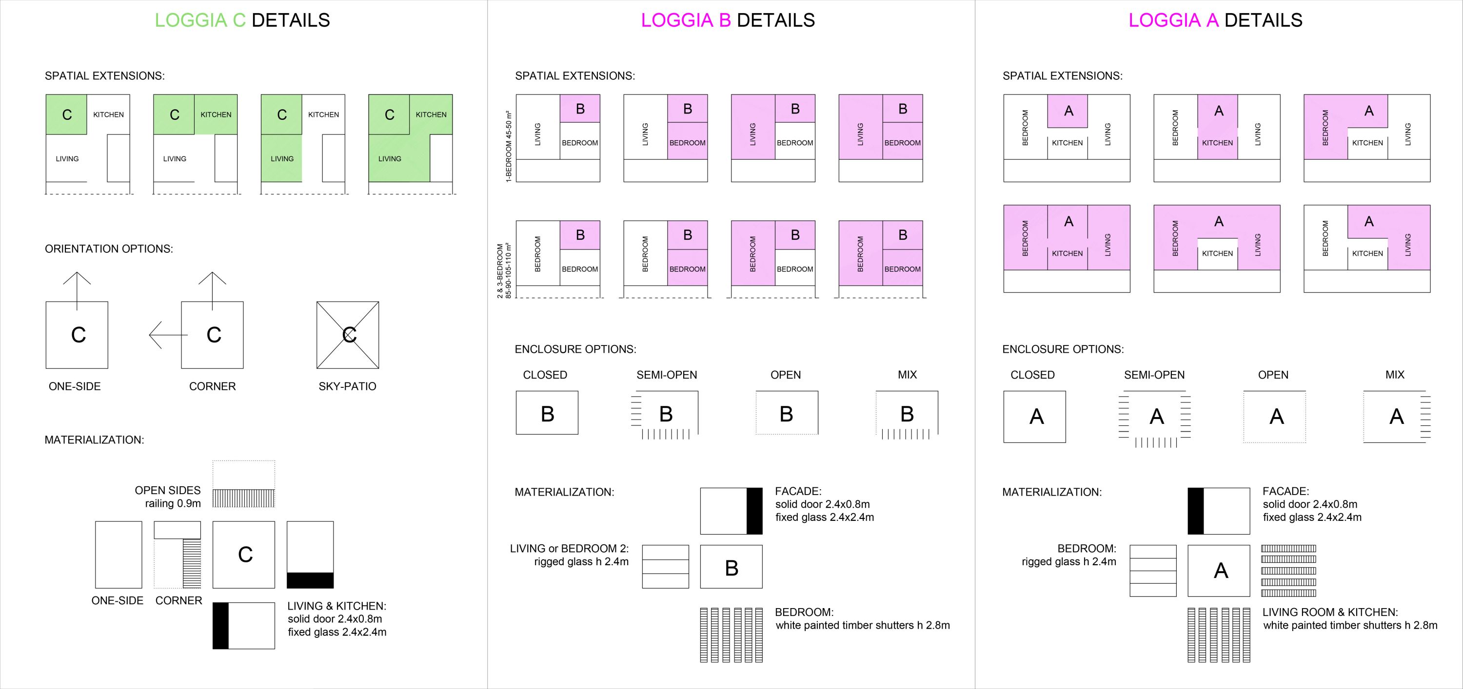 Ovakva strategija stanovanja omogućava kupcima nekretnina više različite opcija. U zavisnosti od broja stanara, njihovog svakodnevnog života i ekonomskog statusa, mogu se izabrati tri različite vrste lođa – (A, B ili C) u okviru pet standardnih veličina stanova. Lođa A i B se razlikuju u odnosu na broj prostorija na koji se nastavlja i u odnosu na veličinu stana. Lođa C je namenjena najvećim stanovima i velikim porodicama koji mogu imati svoju privatnu baštu u okviru dnevnog boravka.