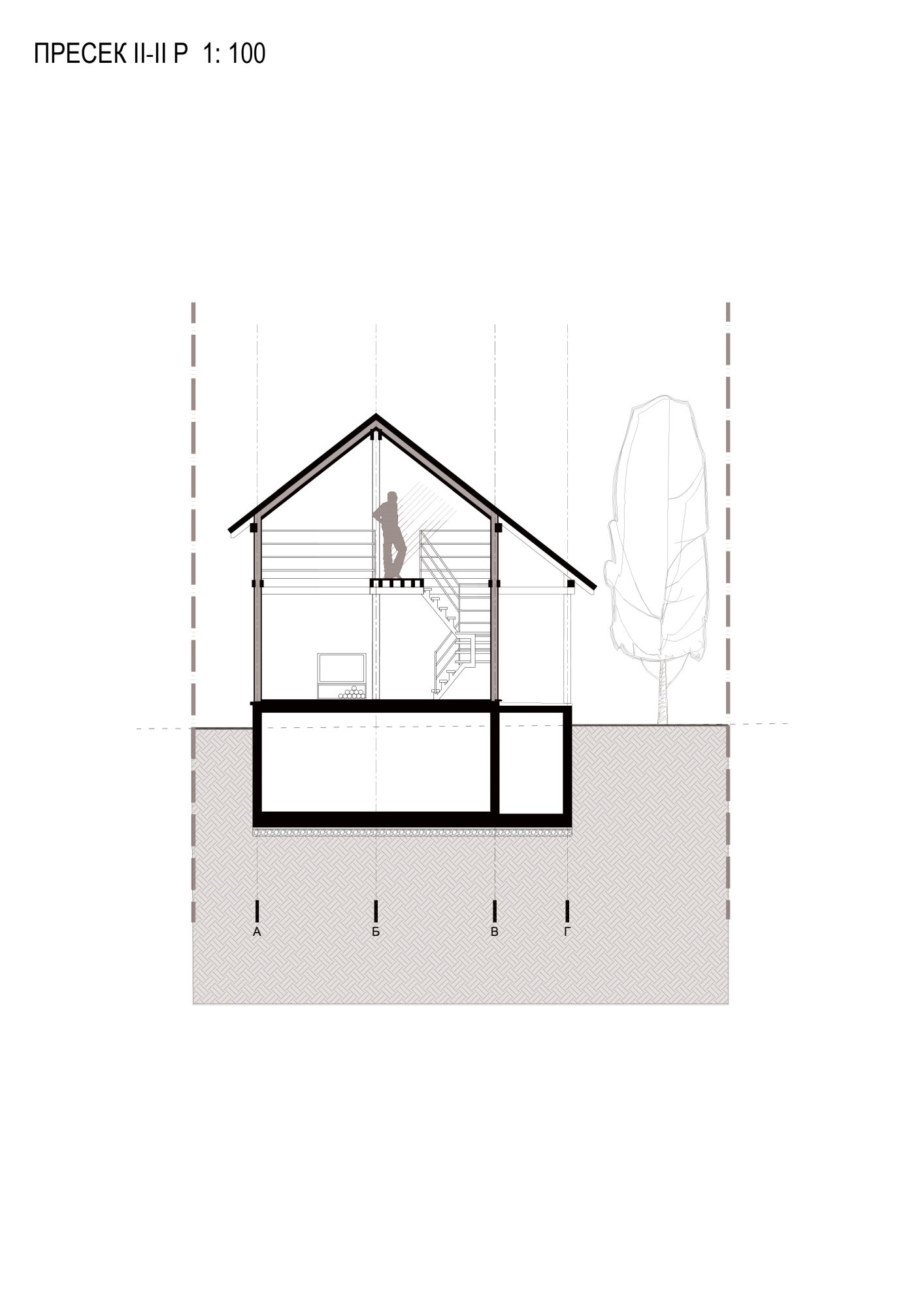 Arhitekta Lalicki sledi koncept „kotobanje“, pa prirodni pad terena koristi za formiranje podrumske etaže, a nad njom parternu strukturu sa prostranim tremom i prizemljem, dok u potkrovlju smešta galeriju.
