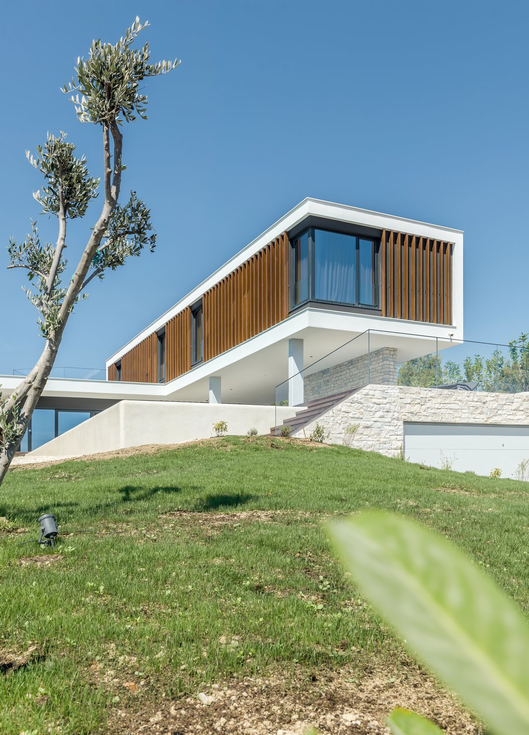 Oblikovanje kuća odredile su dve osnovne premise: orijentacija prema vizurama i stvaranje kvalitetnih spoljašnih prostora za boravak na otvorenom. Ostvareno oblikovanje, u vidu koncepta dva zaokrenuta volumena, upravo odražava te dve premise, kaže Giljanović. Kuće svojim oblikovanjem i geometrijom streme u smeru pružanja vizura čime već na prvi pogled jasno daju do znanja posmatraču šta je inicijator koncepta arhitekture. Paralelno s tim, volumeni kuća formiraju veliki zasenjeni, spoljašnji prostor na koji se direktno veže bazen. Upravo je taj spoljašnji prostor ‘srce’ kuće, a dobrim zasenjenjem omogućeno je njegovo korišćenje u većem delu dana. Softverskom analizom kretanja sunca tokom izrade projekta kontrolisan je kvalitet zasenjenosti tih prostora, kaže arhitektica.