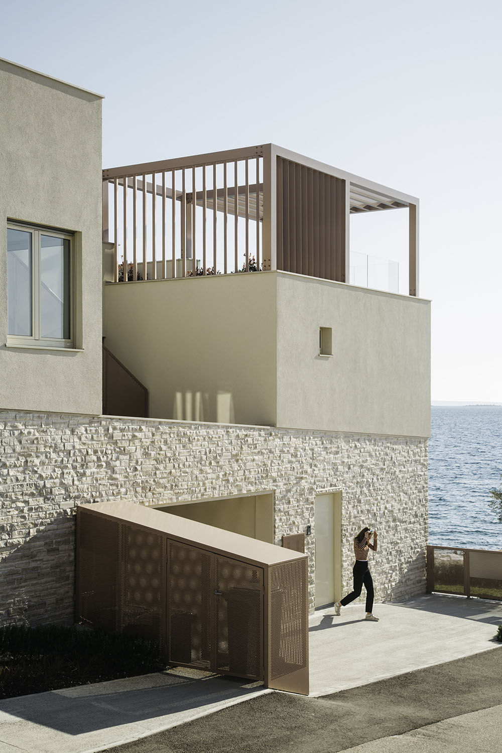 U želji da se otvoreni prostori maksimalno aktiviraju, pergolama su uokvireni prostori iznad ravnih krovova, čime se formiraju otvorene sobe – zasenčene i zaštićene terase s kojih se pruža predivan pogled na okolni arhipelag, more i zalaske sunca.