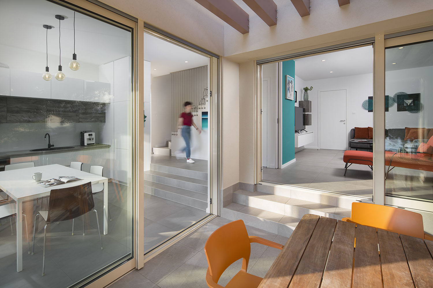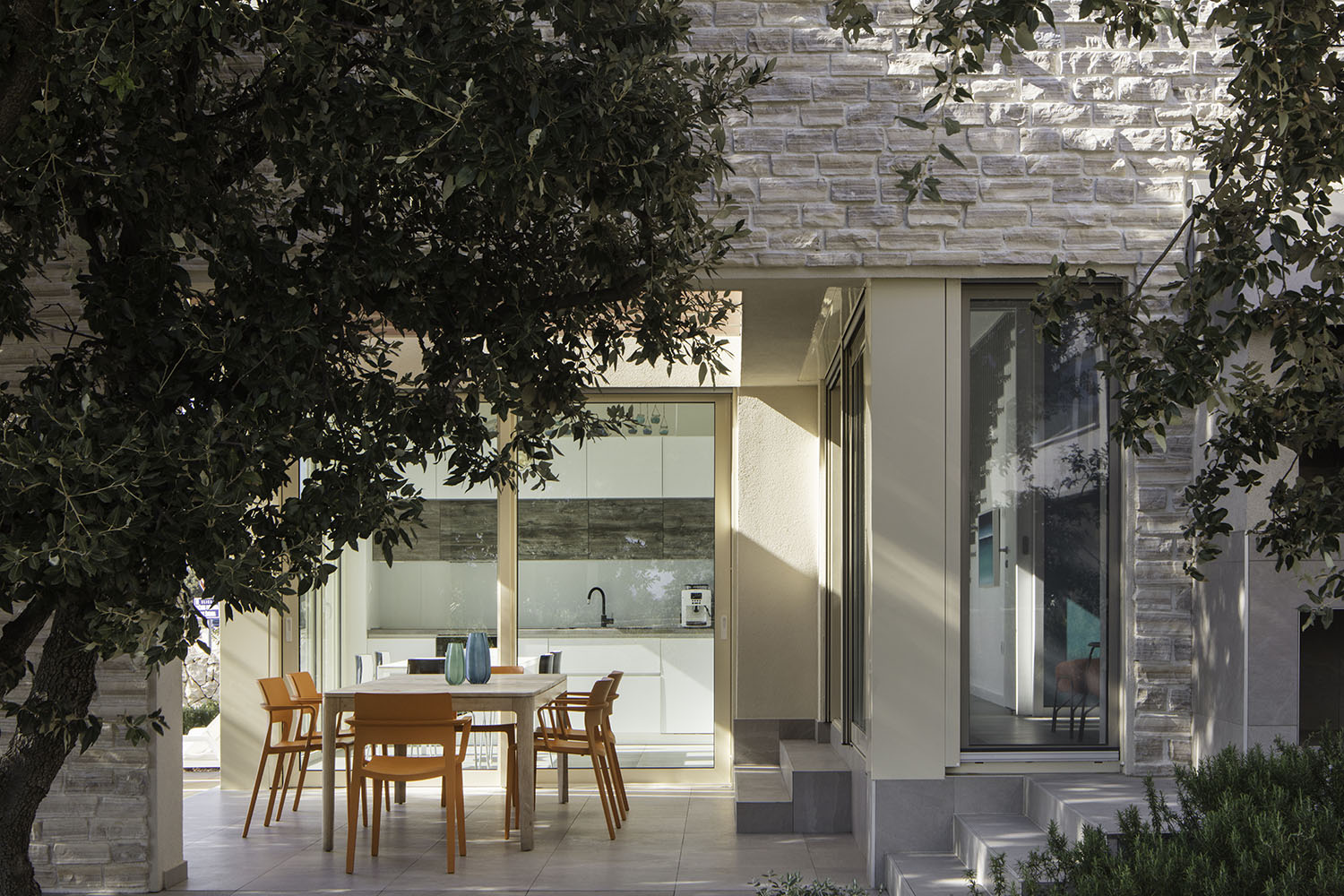 Dnevni prostori trpezarije, kuhinje, boravka i terase stepenasto se spuštaju prateći nagib terena duž parcele. Ovo stepenovanje volumena kućama daje prepoznatljiv sklop i dinamičan karakter u oblikovanju. Osim toga, prostor prizemlja se otvara po dijagonali – što je još jedan od projektantskih principa koji je Adolf Los često primenjivao u svojim projektima, a SODAarhitekte vešto usvojile.