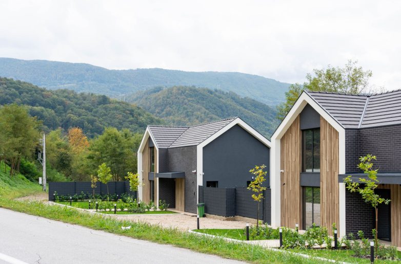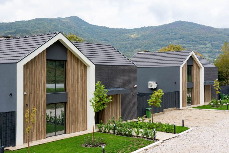 „Materijali i geometrija volumena pažljivo su balansirani kako bi kuće bile istovremeno prepoznatljive, savremene i nenametljivo uklopljene u okruženje. Arhitektura kuća navigira između dva pejzaža: sa jedne strane brda, sa druge reka“, navode iz tima i nastavljaju: