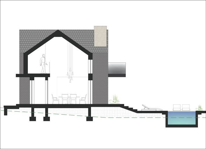 Iz tima ističu da dva detalja posebno oblikuju prizemlje: kamin sa dimnjakom obloženim lomljenim kamenom, koji postaje snažan estetski element i spolja i iznutra, te umetanje dimnjaka u fenestraciju isturenog dela ka reci koje unosi dinamiku u ritam otvora.