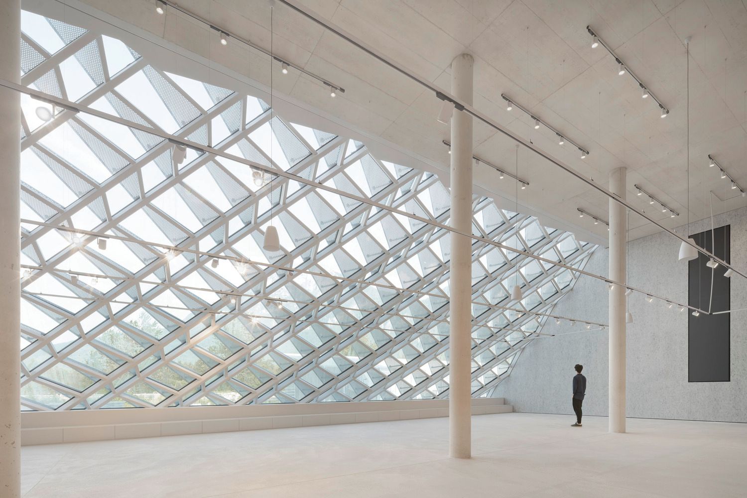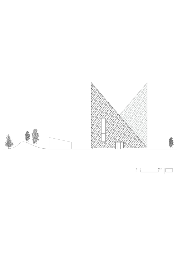 Sa intimnom, ali i monumentalnom vertikalnošću, zgrada maksimalno koristi visinu na svojim vertikalnim površinama, dok se na kosim stranama prilagođava ljudskoj meri. Ovaj kontrast ne samo da ističe zgradu unutar njenog okruženja, već stvara i vizuelni dijalog između arhitekture i prirode.