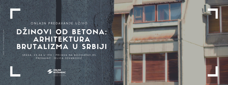 Božidarac Digital organizuje besplatno onlajn uživo predavanje uživo Džinovi od betona: arhitektura brutalizma u Srbiji u sredu, 22. aprila u 19 časova. Sagovornica na ovu temu i predavač je Jelica Jovanović.