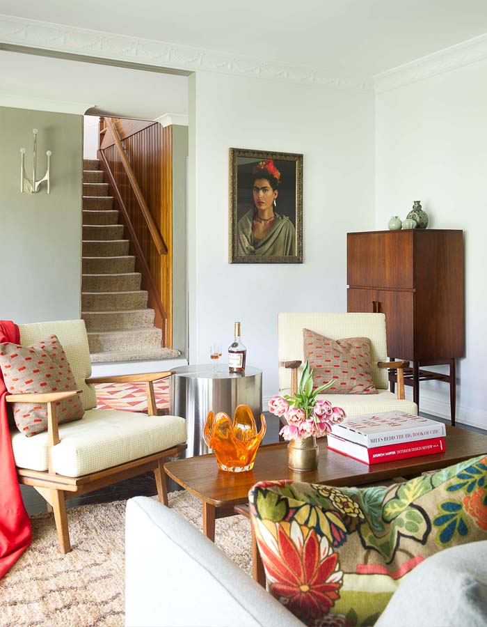 Retro stil, u koji možemo da svrstamo ovaj enterijer, je veseo sa geometrijskim motivima dok su boje su uglavnom svetle i jarke. Projektanti australijskog studia za projektovanje BMID su najviše koristili crvenu, narandžastu i žutu koje se uglavnom pojavljuju na zavesama, jastucima, tepisima ali i manjim komadima nameštaja kao što su fotelje i komode.