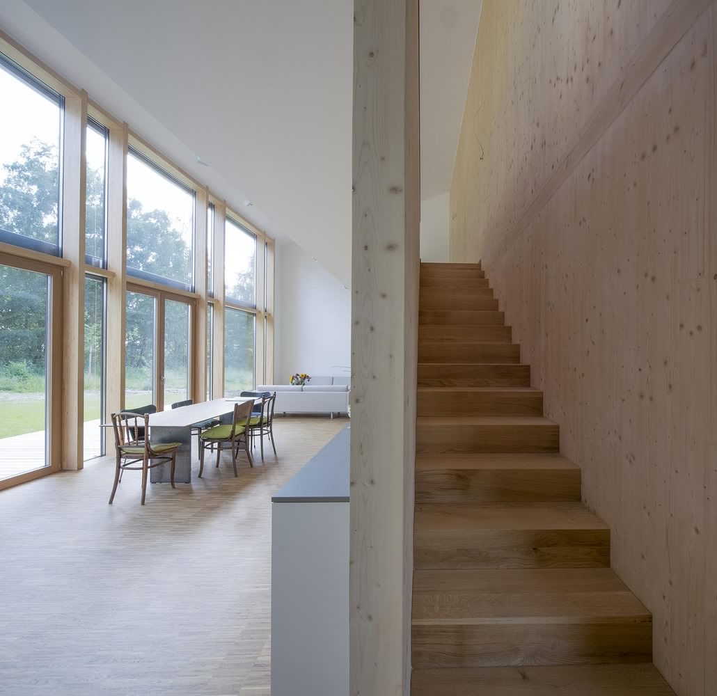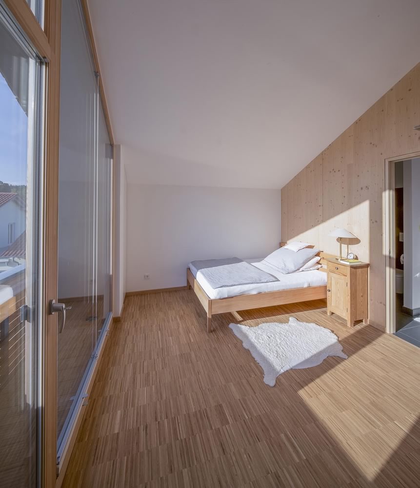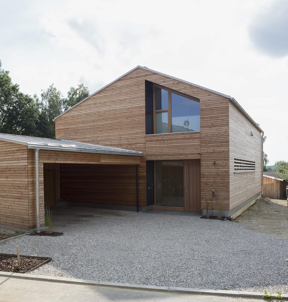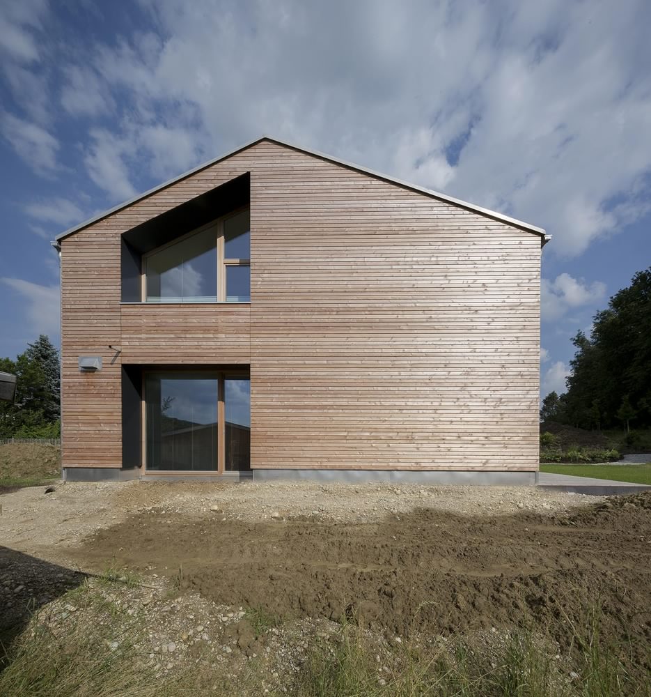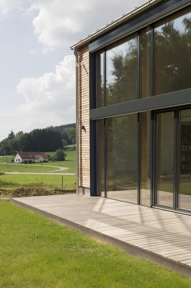 Kuća u Dorfenu od 150 kvadrata, čiji projekat potpisuju Wolfertstetter Architektur, na izgled ne deluje previše toplo pre svega zbog ogromne staklene fasade od oko 60m². Ipak, stvari stoje sasvim drugčije. Pre svega, staklena površina okrenuta je na jugozapad, odakle i dolazi najveći priliv sunčeve energije, a kao drugo, radi se o trostrukim prozorima izrađenim u kombinaciji drvo-alumijum.