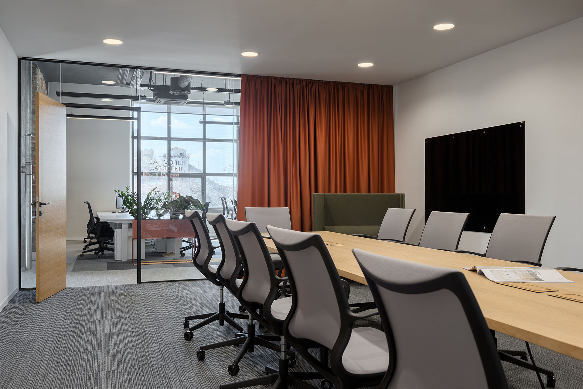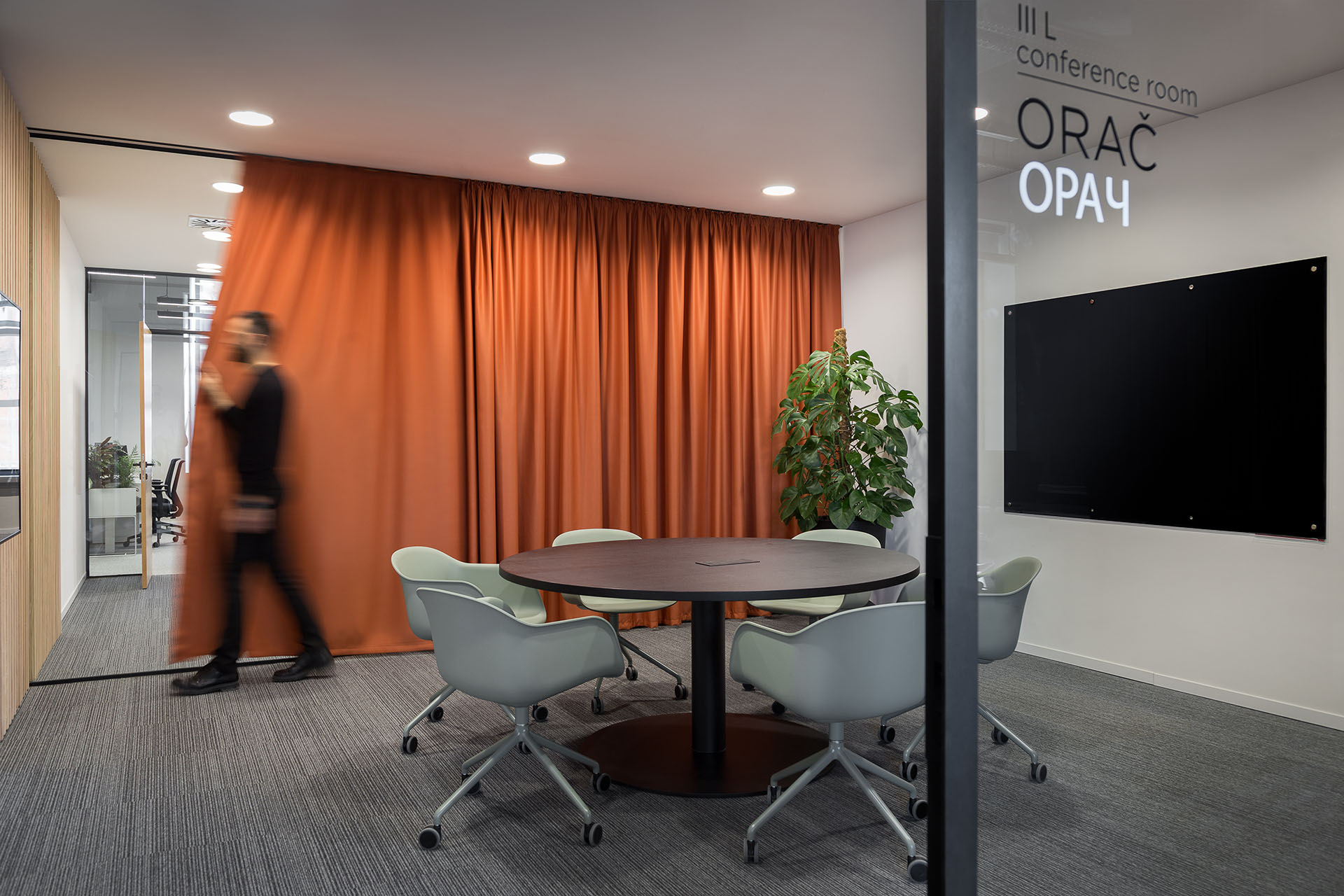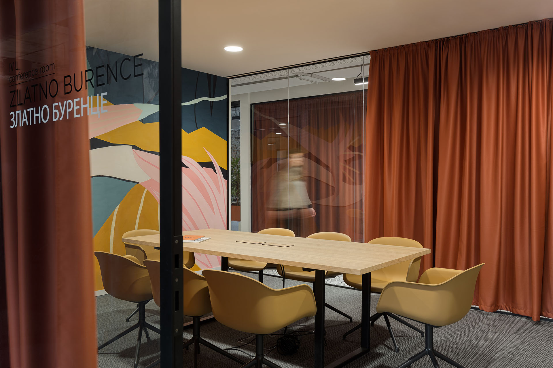 Što se tiče materijalizacije, za visokofrekventne pozicije – poput hodnika, toaleta, kantine… – korišćen je mikrotoping za podnu oblogu, dok su radne zone i sale za sastanke prekrivene itisonom, koji je zadržao specifičnu šaru provučenu kroz ceo objekat.