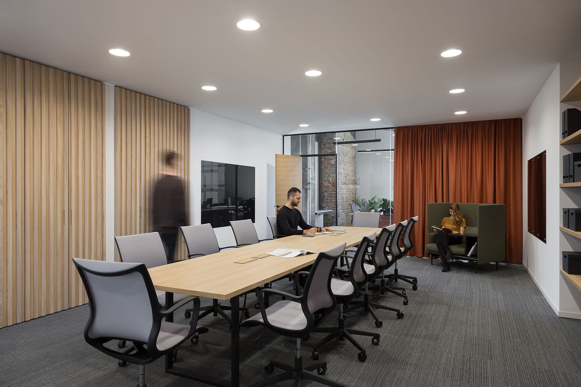 Kako je struktura zgrade već bila definisana, layout je organizovan tako da radna mesta sa prirodnom svetlošću dobiju primat, raspoređena pored velikih prozorskih otvora, dok je centralni deo prostora bio rezervisan za sale za sastanke i druge veće grupne aktivnosti.