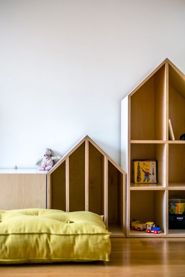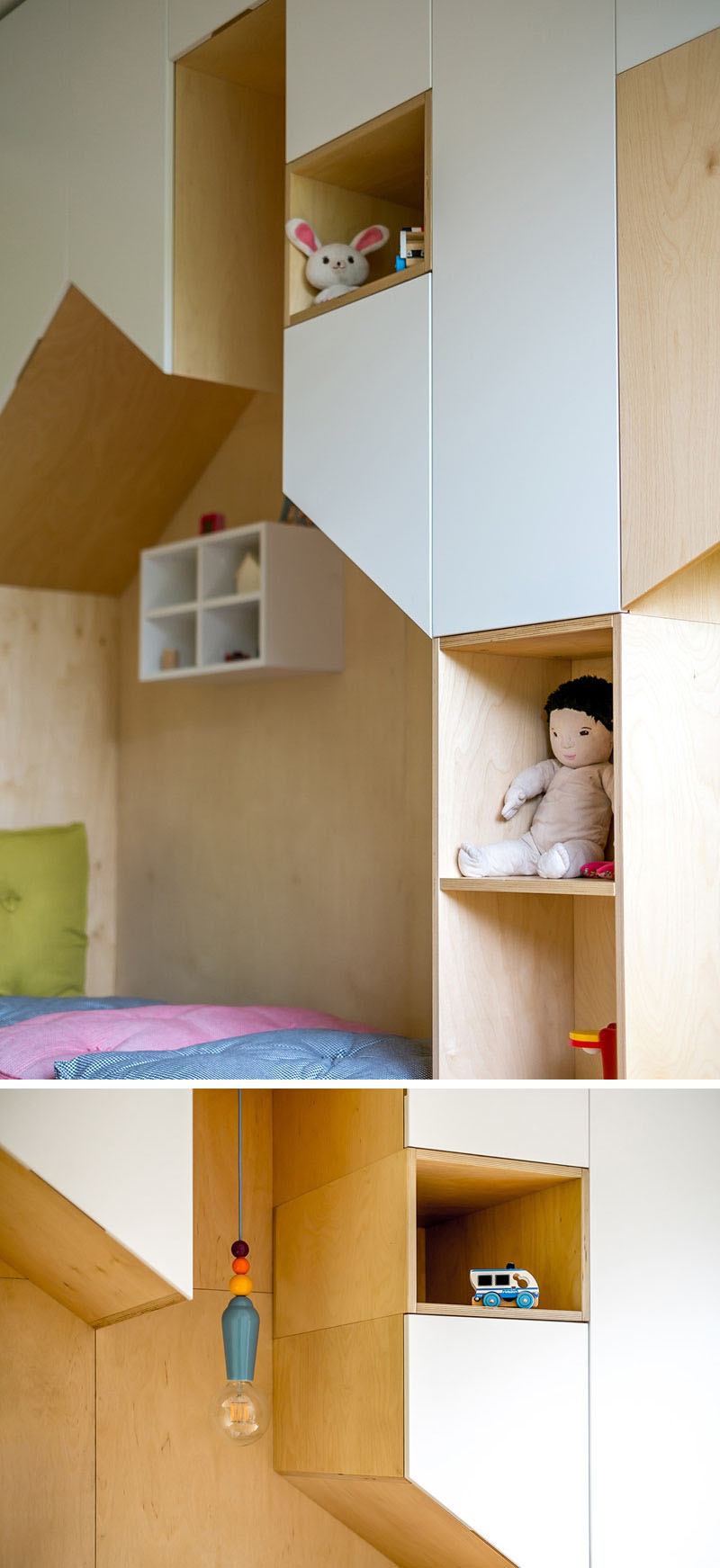 Zadatak je bio osmisliti sobu koja će biti udobno mesto za spavanje, ali da ujedno postoji i prostor za dodatne ležajeve ali naravno i dovoljno mesta za igru. Kao rezultat, nastali su elementi za skladištenje postavljeni na zidu, koji formiraju okvir kreveta, nalik kućicama, piše Contemporist.