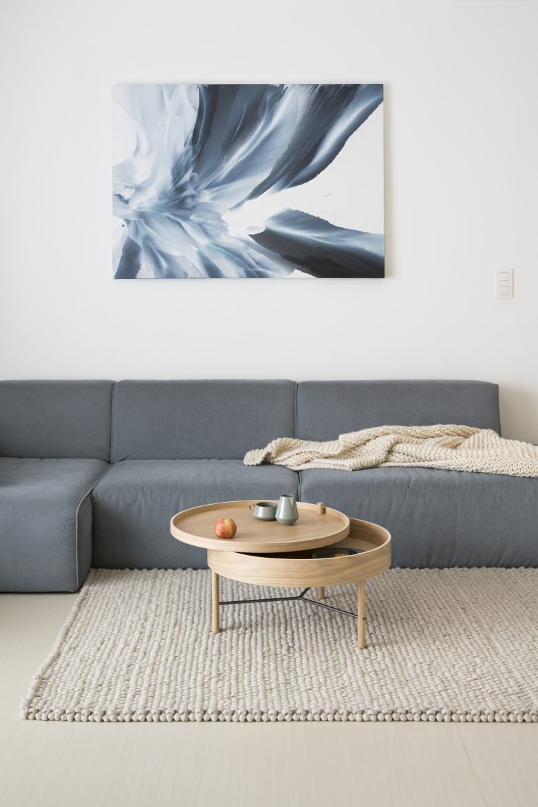 Svedeni prostor dnevne zone u prizemlju razigran je vizuelno kompatibilnom slikom i TV komodom u plavim tonovima, umetnice Patricia Koyšová.