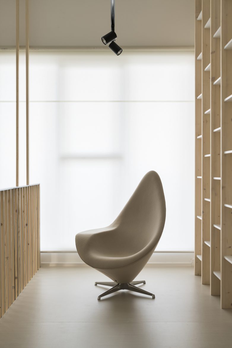 Zajednički prostor na spratu preoblikovan je u otvorenu zonu povezanu sa terasom, u kojoj je sada smeštena biblioteka i opuštajući prostor za čitanje.