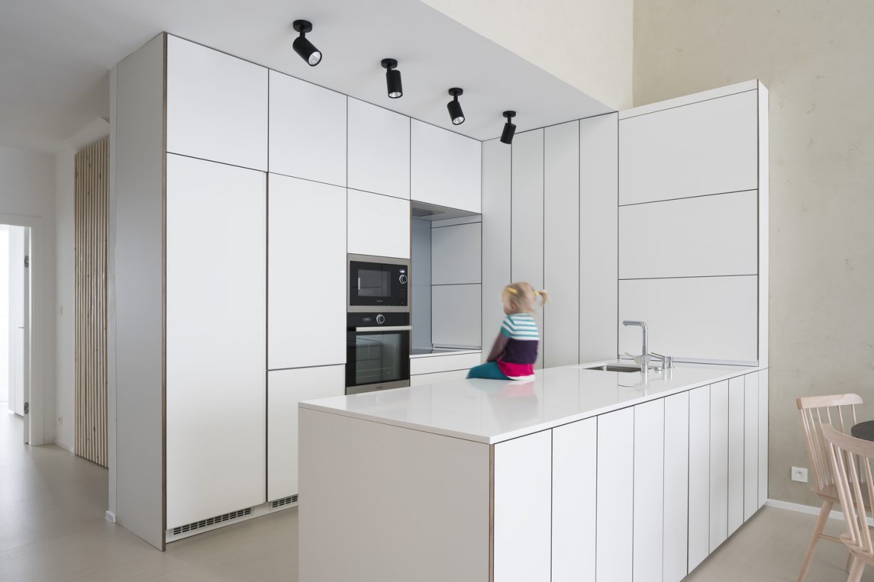 Elegantna i svedena kuhinja, kao i ostali skladišni prostor izveden je bez upotrebe ručki. Cilj je bio postignuti efekat čistih monohromatskih površina.