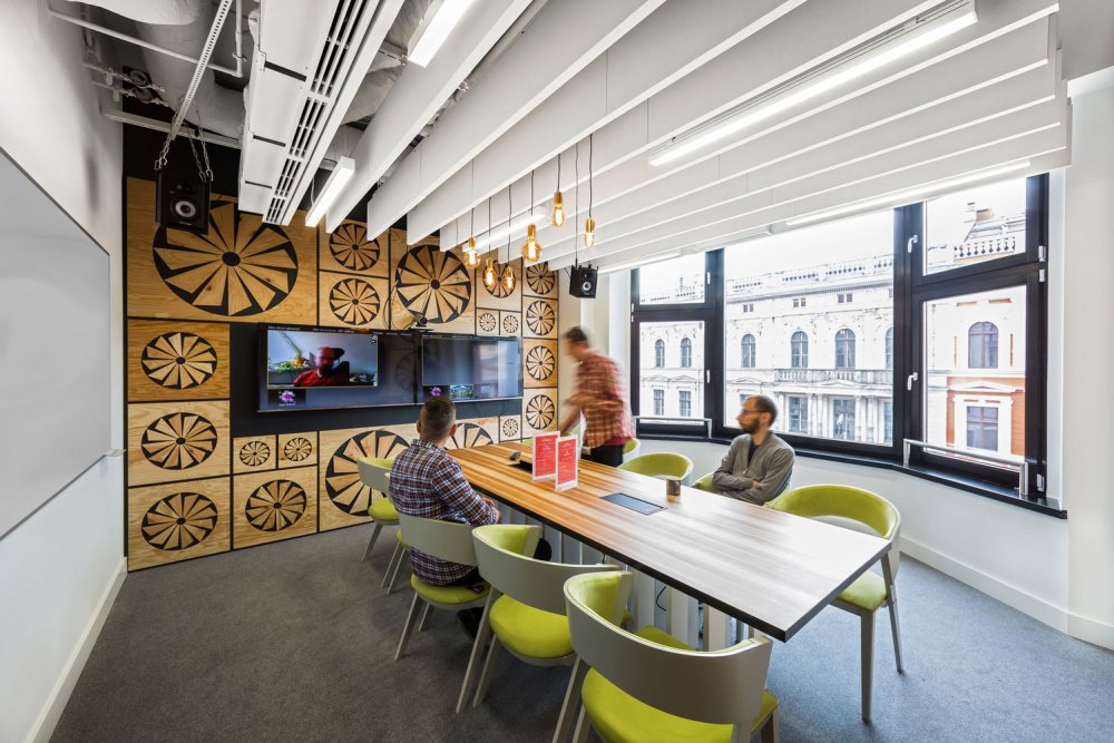 Kancelarije se nalaze u staroj zgradi u srcu Vroclava pa je tako i enterijer morao da zadrži duh minulih vremena ali upakovan na nov, savremen način. S jedne strane, tu su mozaik keramičke pločice i originalna opeka, a s druge strane stolovi popunjeni flopi disketama, piše Inhabitat.