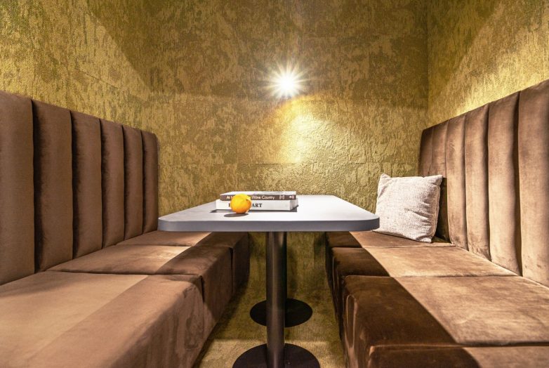 “Na poslednjem spratu kao podnu oblogu koristili smo parket i tu smo malo otišli u smelijem pravcu, u smislu da smo koristili bronzane lustere sa kuglama, sofe i fotelje u jarkim bojama poput narandžaste i ljubičaste, isto tako i zeleno/narandžaste boje zidova, ratan, mermernu ploču na šanku, različite stolice da bi se prostoru unelo dodatne dinamike”, objašnjavaju autori projekta enterijera.