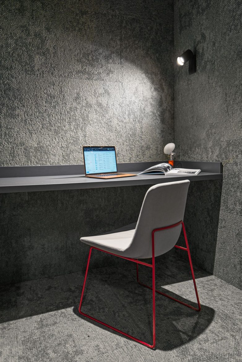 Ljušturu prostora čine velike staklene površine, betonski plafon, jednobojni itisoni, funkcionalna rasveta i jednostavni zidovi, dok su onda mikroceline oplemenjene tepisima, sofama i foteljama sa ekscentričnim teksturama i materijalima.