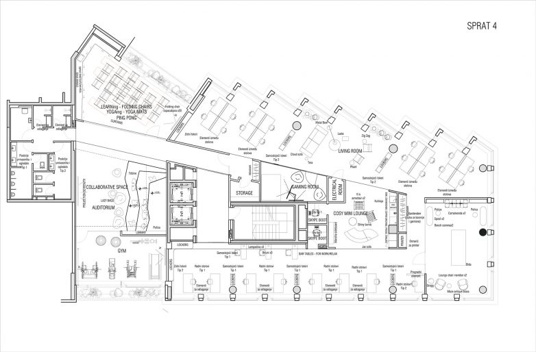 Radni prostori su organizovani u blokovima od nekoliko radnih stolova, ali je ideja bila da to ne bude neprekidni niz kao u korporativnim kompanijama, nego da se posle svaka, u proseku dva bloka, desi prekid u vidu jedne zone za opuštanje koja se sastoji od udobne sofe i fotelja.