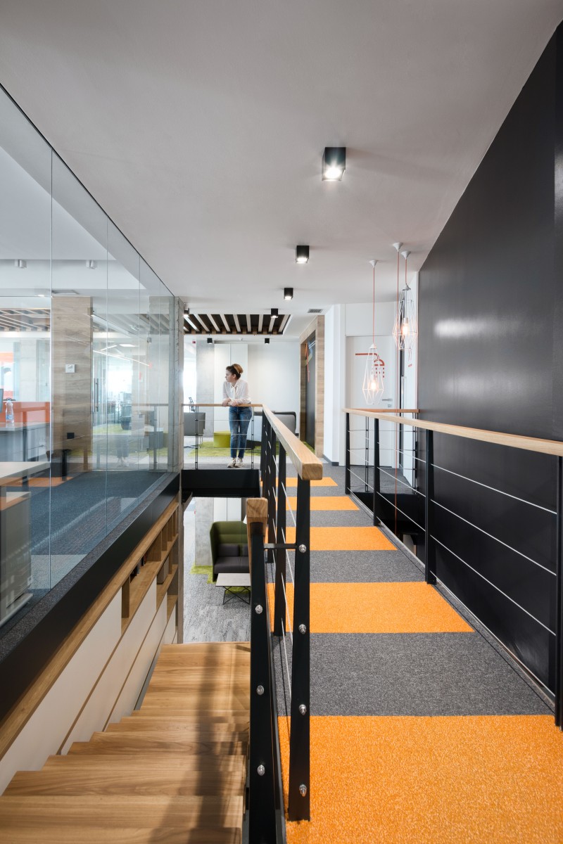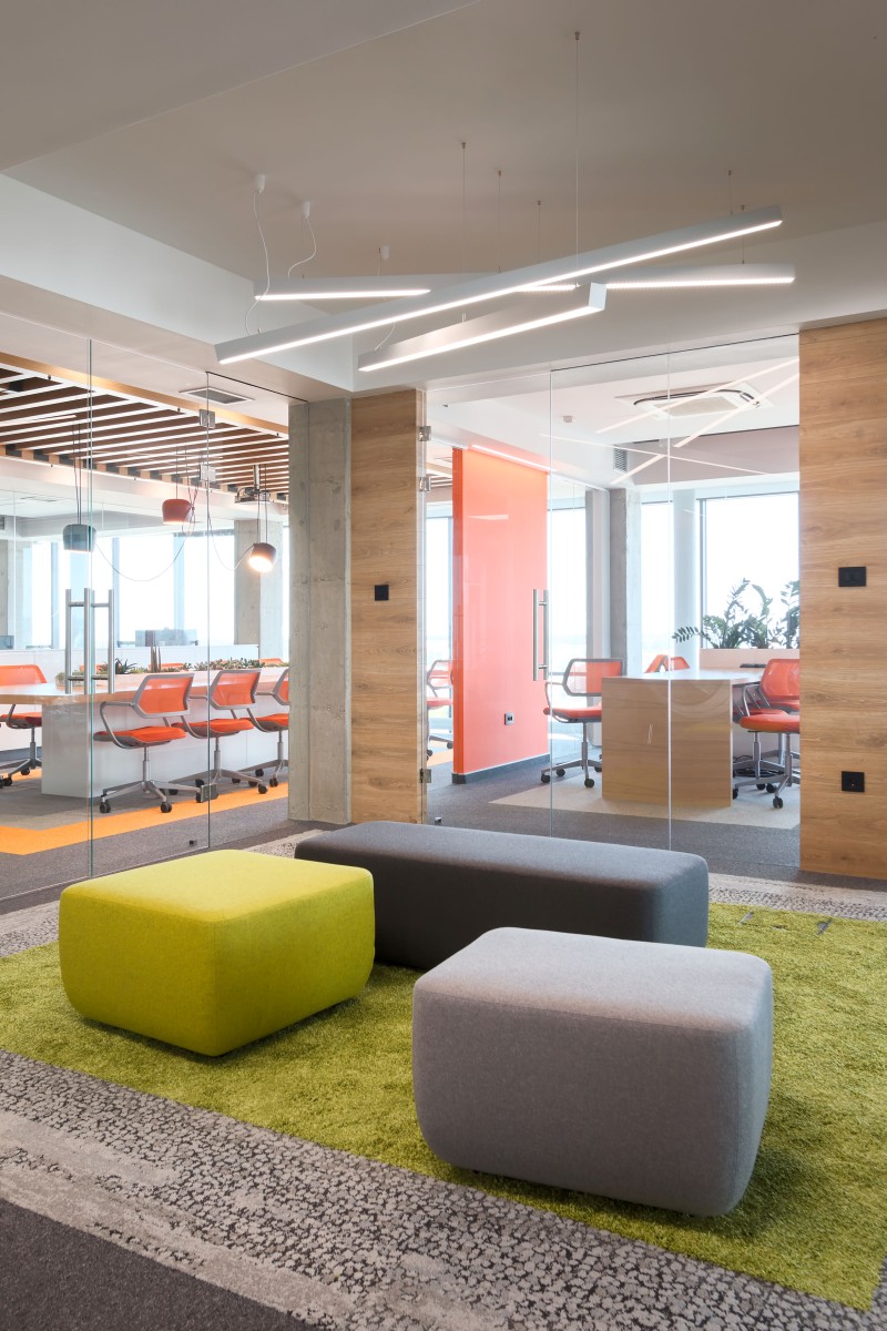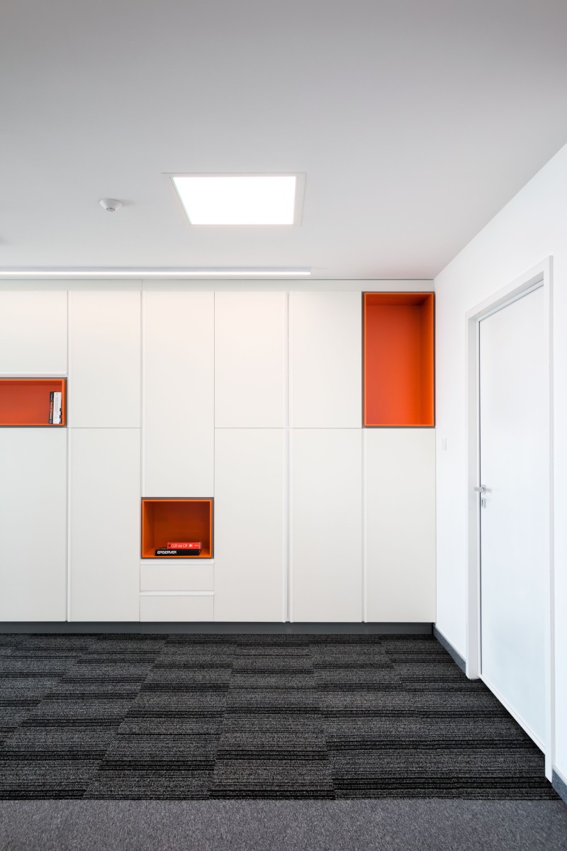 Narandžasta boja, kao deo vizuelnog identiteta firme, upotrebljena je i u koloritu enterijera. Komadi nameštaja, itison kao i neki detalji su u bojama firme.