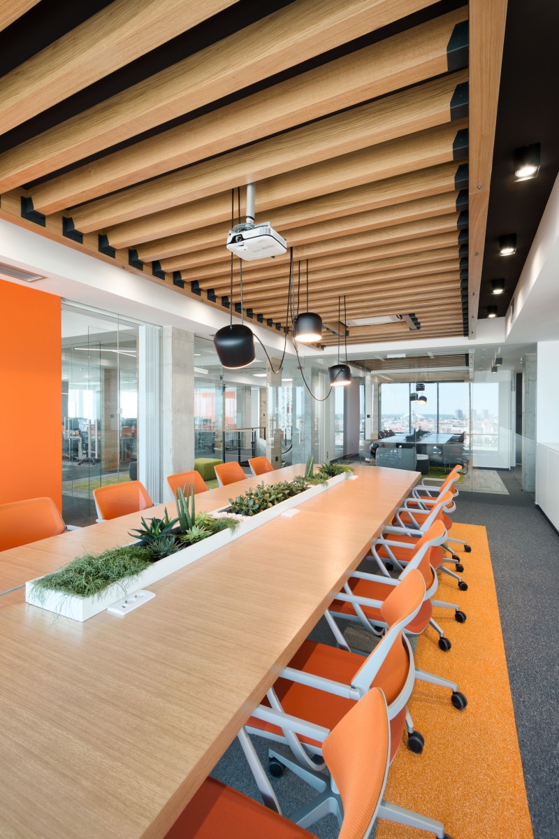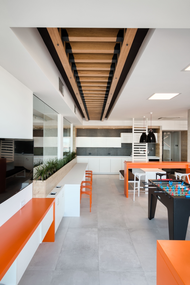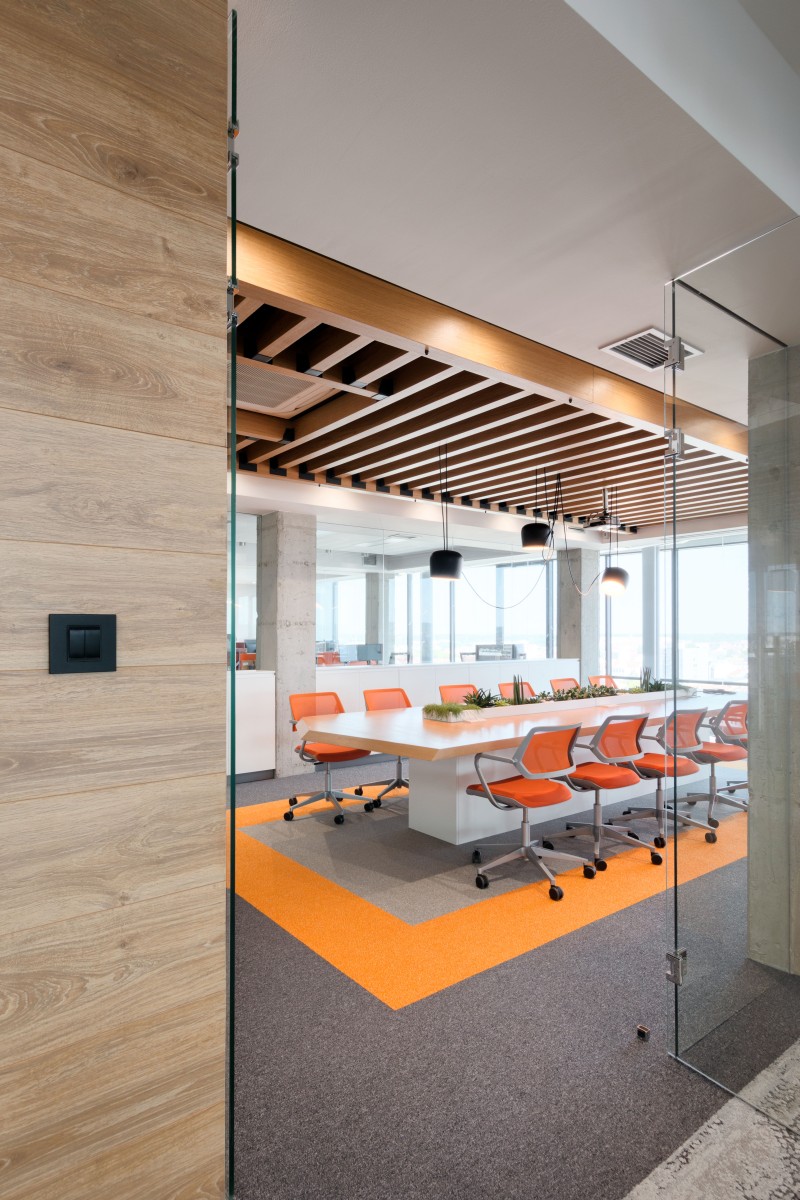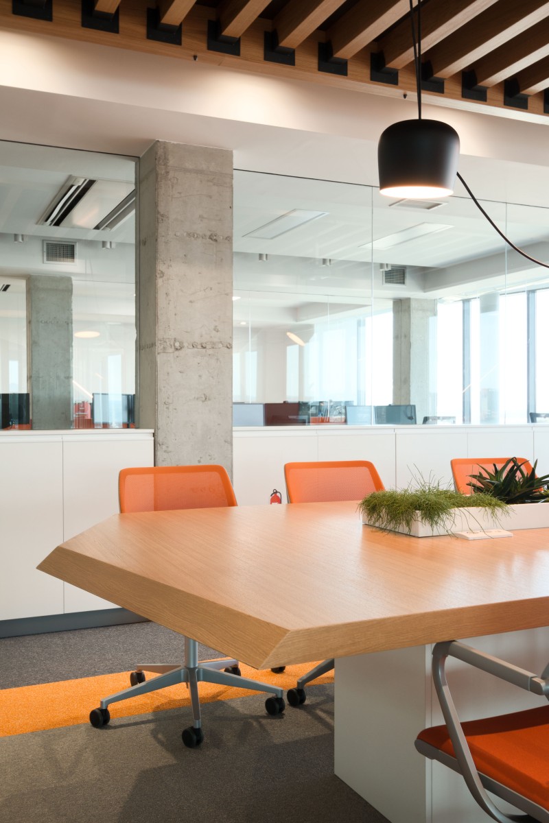 Narandžasta boja, kao deo vizuelnog identiteta firme, upotrebljena je i u koloritu enterijera. Komadi nameštaja, itison kao i neki detalji su u bojama firme.