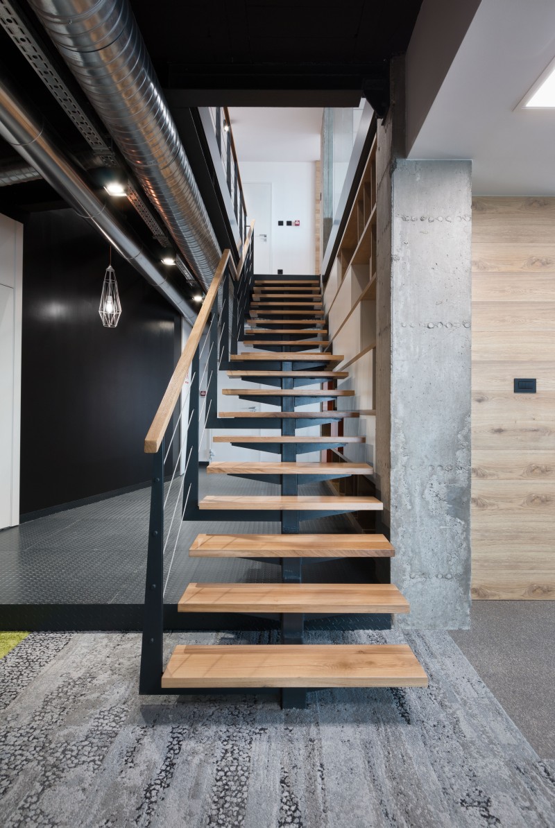 Prostorom dominiraju, kao kontast velikim površinama stakla, neobrađeni stubovi od betona. Kako bi se utoplila ova ova dva hladna materijala, na ulazima u kancelarije stavljena je drvena obloga.
