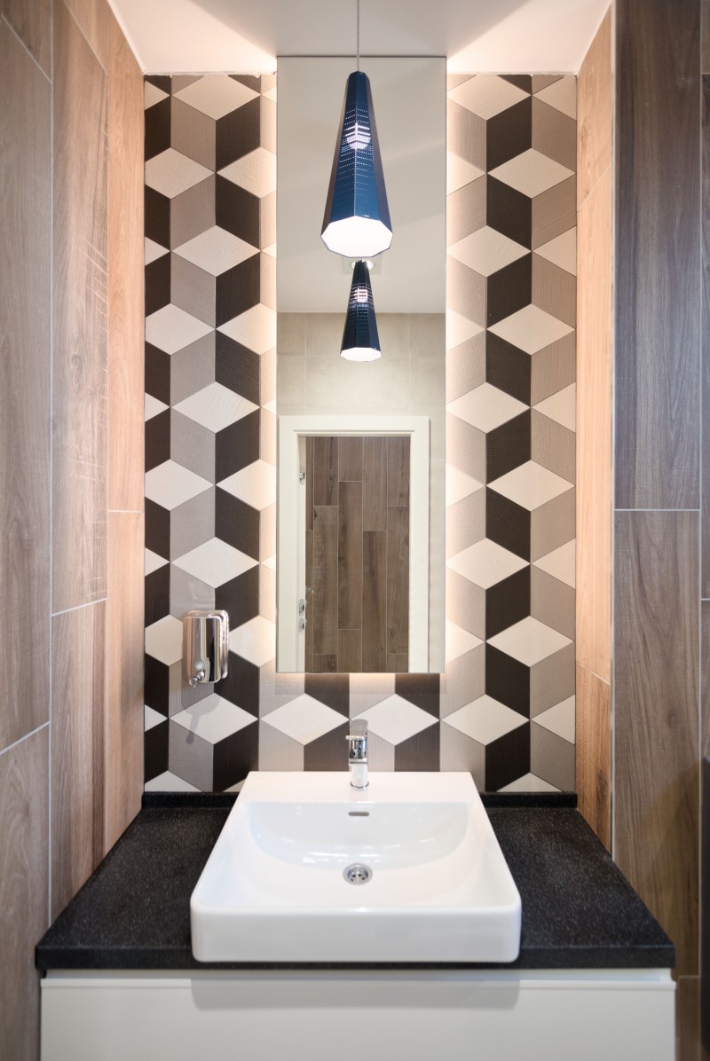 Strogi geometrijski oblici primenjeni su i u toaletima. Zato je na zidovima postavljen mozaik s romboidnim pločicama koji prave zanimljiv vizuelni trik.